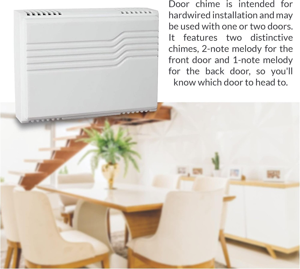 Contains everything you need for a basic door chime box setup: (1) doorbell chime, (1) 16V/10VA transformer, and (1) surface mount lighted push button. This will set up your home to be notified for any visitor or incoming delivery. Door chime is intended for hardwired installation and may be used for the front door (2-note sound). Surface mount lighted push-button is quick and easy to install and can be mounted to the doorframe or exterior wall of your home. Door chime measures at 7-3/16 inches in width and 4 inches in height. Door bell button measures at 7/8 x 5/8 x 2 3/4 inches PLEASE NOTE: The transformer in this kit WILL NOT work with most video doorbells, such as RING. Search 30TR for a compatible transformer.