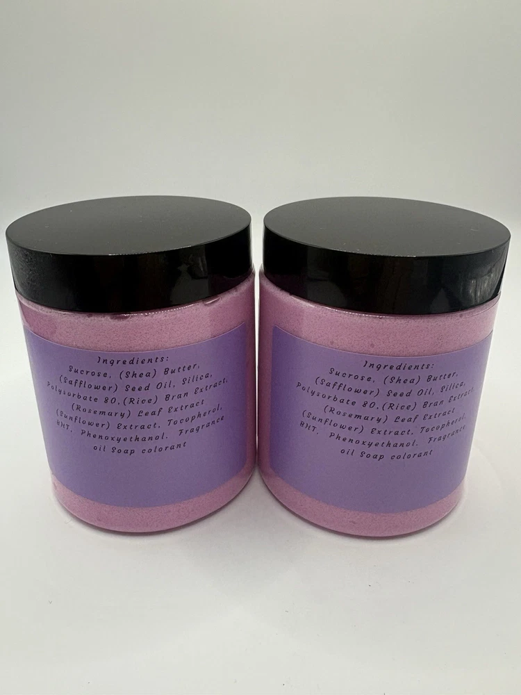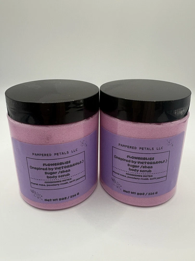 This set comes with two 8oz jars of my handmade sugar/shea body polish it’s exfoliating and hydrating at the same time .the product goes on silky and the dry down makes your skin very soft !Two Piece FLOWERBOMB (inspired) Body Scrub Pamper Set.