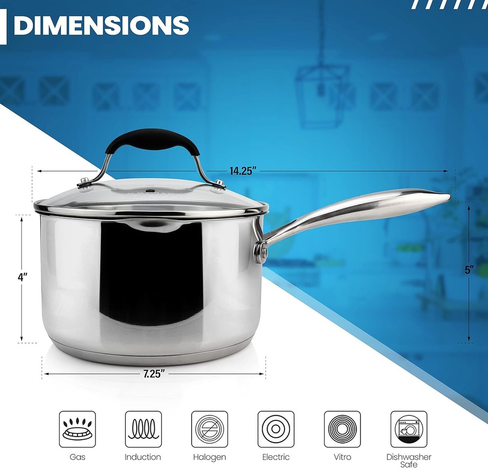 Product Description Two Side Spouts for Easy ... Stainless Steel Saucepan with Glass Strainer Lid Stainless Steel Saucepan with Glass Strainer Lid, Two Side Spouts for Easy Pour with Ergonomic Handle, Multipurpose Sauce Pot (Tri-Ply Capsule Bottom, 2.5 Quart) 18/10 FOOD GRADE STAINLESS STEEL SAUCEPAN: 2.5 QT saucepan with strainer glass lid. Special matte finish inside to prevent scratches over time and mirror finish outside for shiny and stylish look. Easy to read measurement marks inside. Your best saucepan with lid & a cooking pot. All-IN-ONE FUNCTION: Shatterproof glass cover with straining holes on both sides to strain pasta, noodles, vegetables & more. No colanders needed. Pour spouts on both sides of the rim for right and left handed. Silicone lid handle for safety! Best cooking pots with lids. EVEN HEAT DISTRIBUTION: Specially constructed 5-ply stainless steel base with multi-clad construction avoids heat spots and distributes heat evenly, saving energy! Long & large ergonomic handle. Keeps handle cool stainless steel pot is hot. Induction pots and pans. BEST QUALITY, EASY TO CLEAN AND DURABLE: Made only with high quality 18/10 food grade stainless steel, which is highly durable, resistant to rust, stain, corrosion or crack, and to top it, designed to look elegant in kitchen. Dishwasher, Refrigerator safe. GUARANTEED SATISFACTION: is the most trusted emerging woman owned small business! At , we’ve always got your back! Contact Us We reply any email messages within 1 business / working days(off-duty at weekend). If you do not get a response from us, then please check your junk or spam mailbox. Our Business hours: Mon-Fri 9:00-18:00, UTC/GMT +8 hour s . Please contact us either by clicking "contact seller" in the "purchase history" section or simply click "ask a question" at the bottom of this page. If you are unsatisfied with our item or service, please contact us before leaving any feedback. We are committed to resolve all issues in a friendly and satisfactory manner. To provide you with better service, please provide the following information in your email: Your ebay ID Order problem, order number For product questions, the eBay article number, the product URL or the product SKU Unfortunately, the eBay guidelines do not allow us to provide a phone number. But if you'd rather call please send us an email. powered by