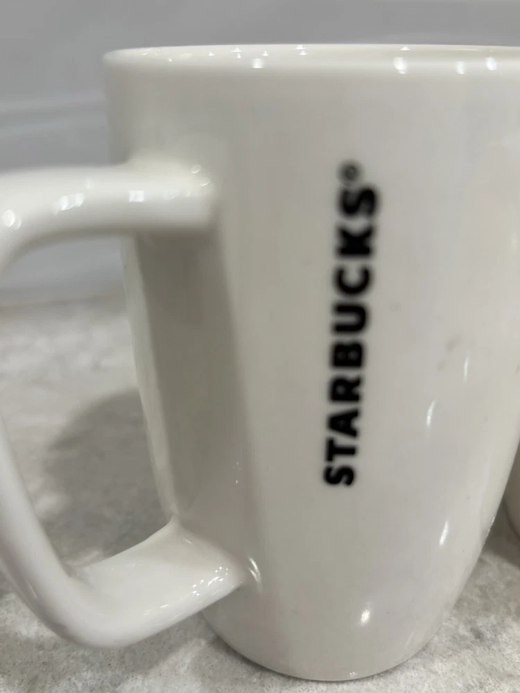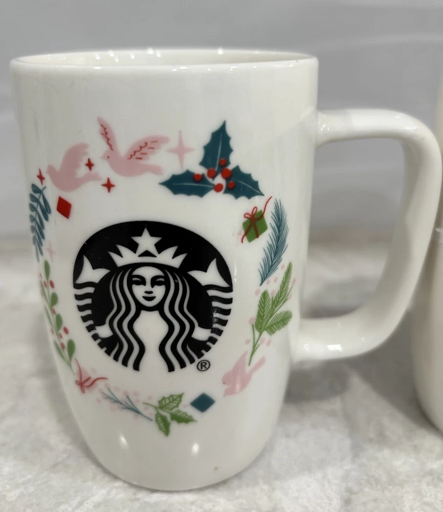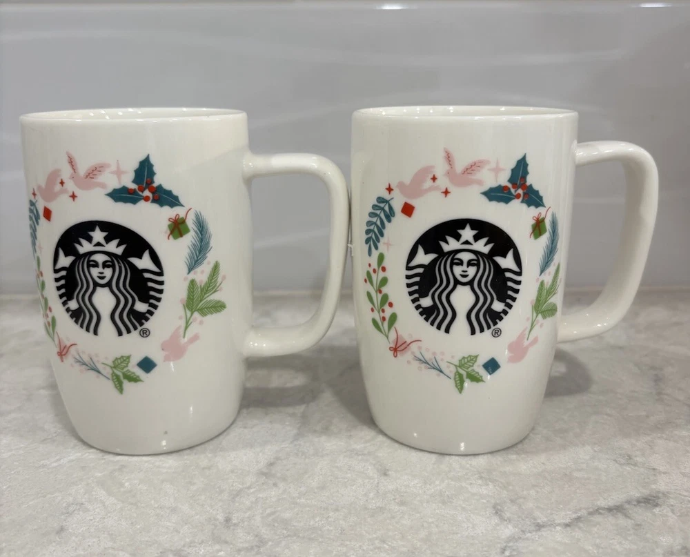 Pair of Starbucks holiday mugs with black logo surrounded by wreath of holly. 8 oz. Not dated. Square handle. Measure approximately 4 1/4” tall and 2 3/4” in diameter. New. No chips or cracks.