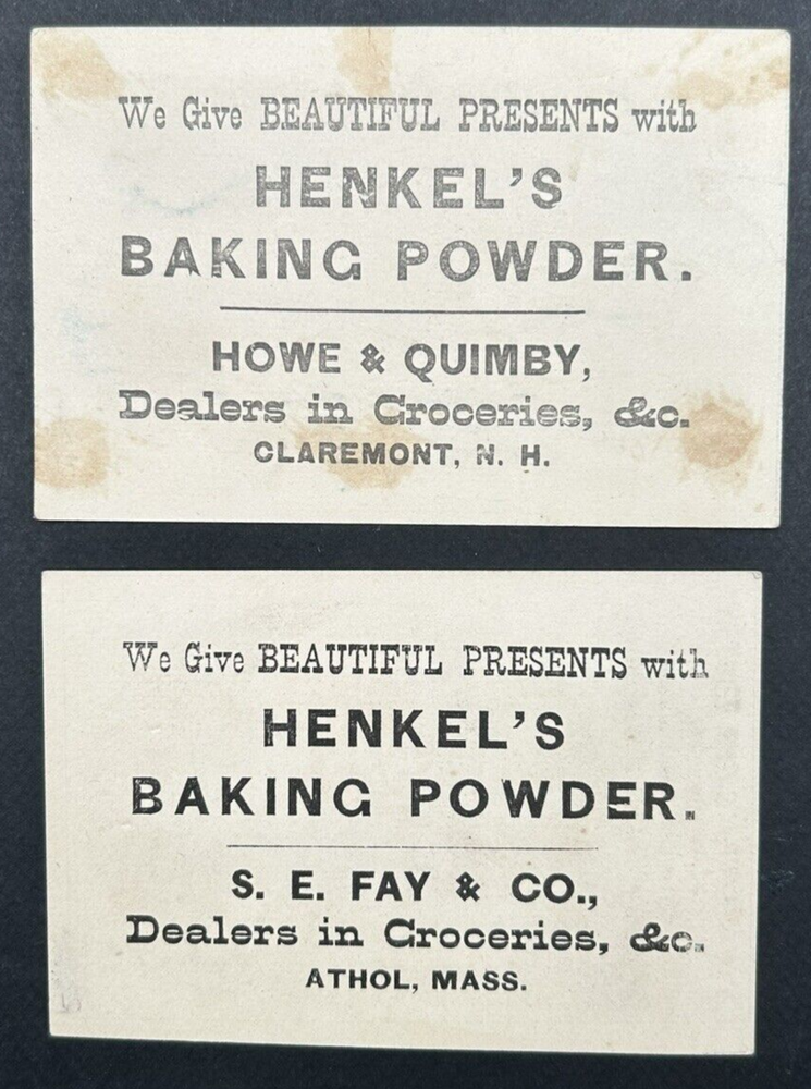 Two trade cards for Henkel's Baking Powder, manufactured by Henkel Bro's in Paterson New Jersey.