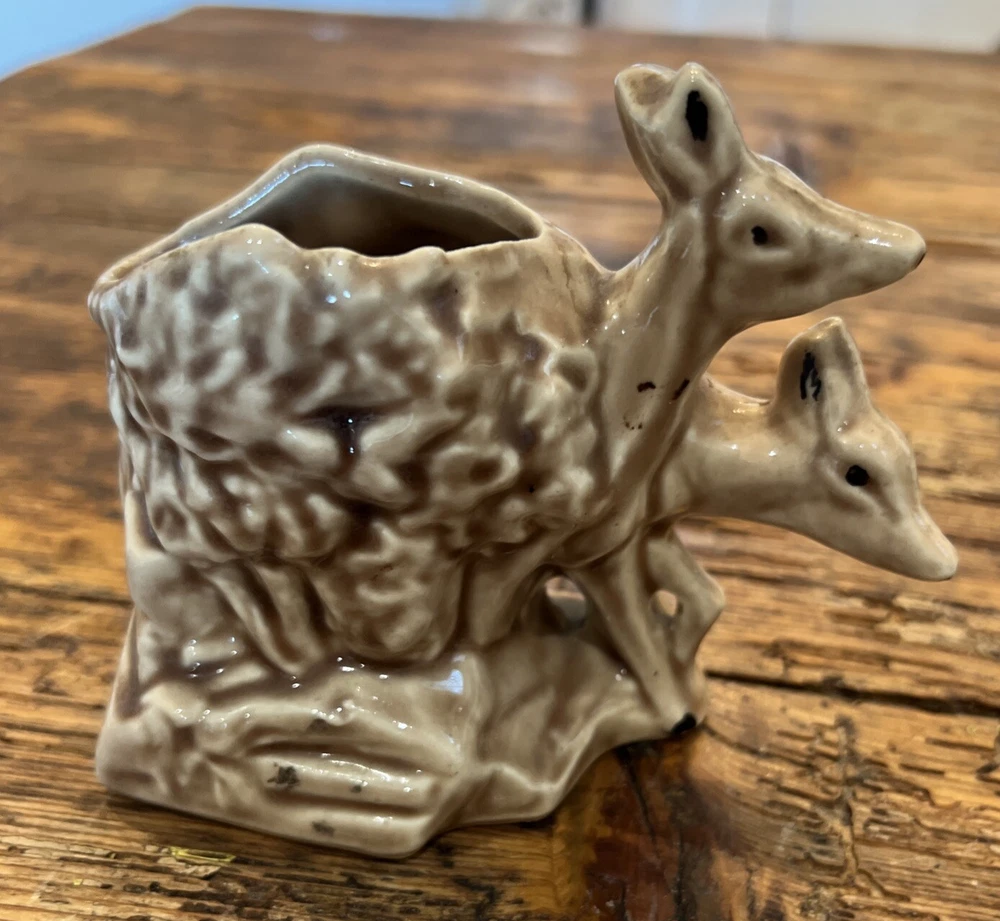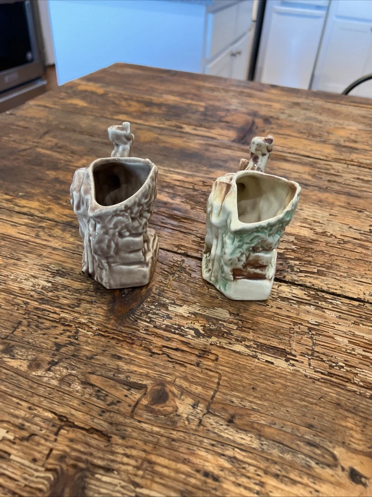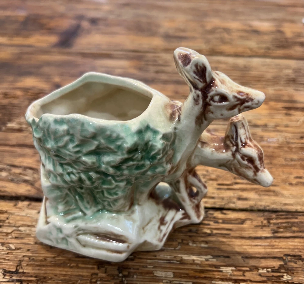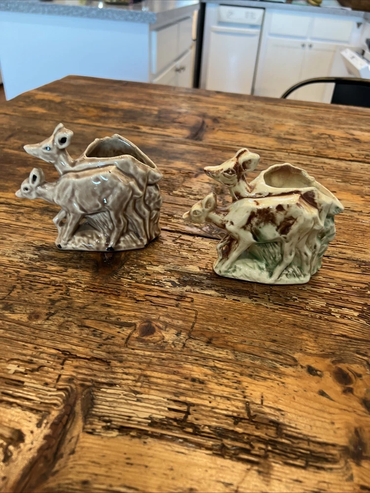 This pair of vintage planters from McCoy features a brown and green glaze with a deer and fawn design. The planters are made of clay and have a impressed backstamp. They were produced in 1957 and are in the Mid-Century Modern style. The planters are 4 1/4" in height and 6" in width and weigh 11 oz. They are original and have a production style of art pottery. These planters are perfect for indoor use and are a great addition to any collection. The green brown planter has a rim chip otherwise very good condition with no other chips or cracks.