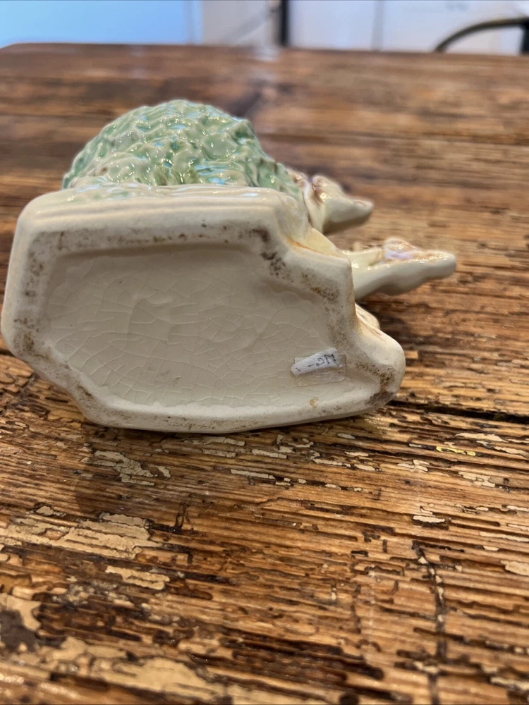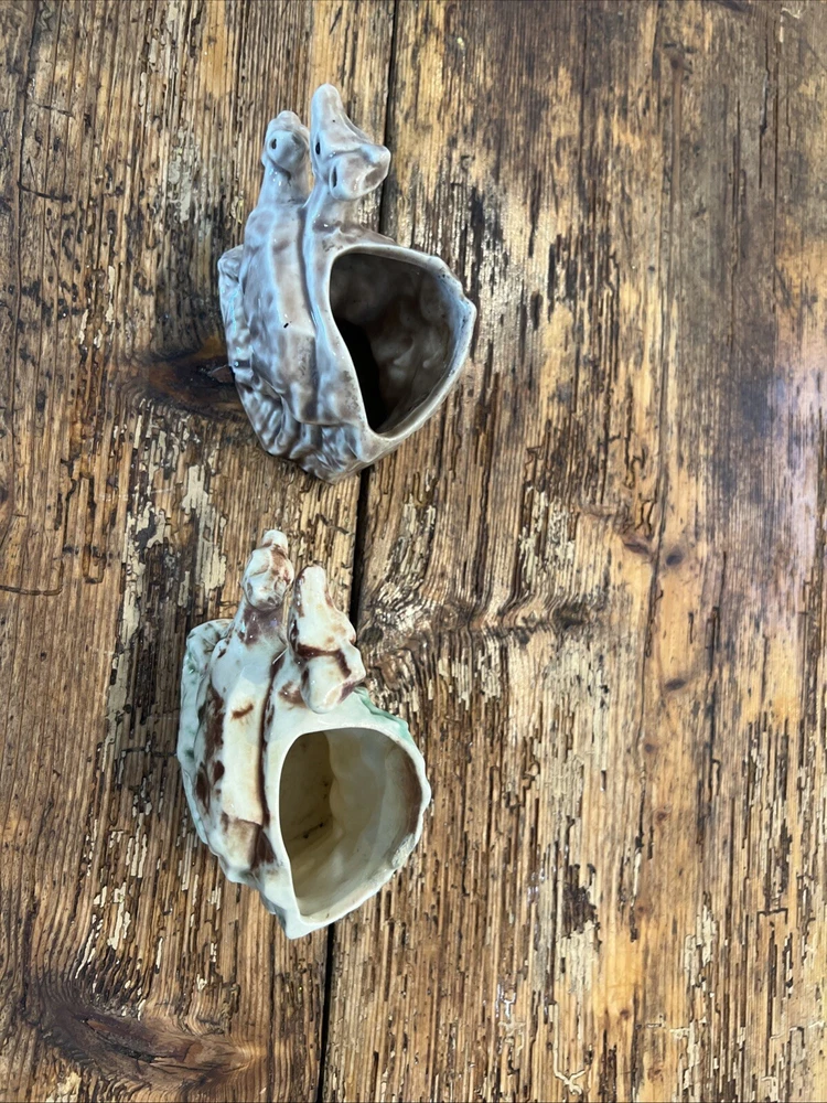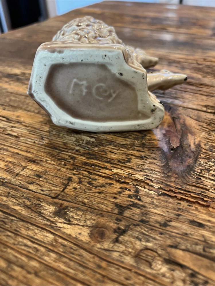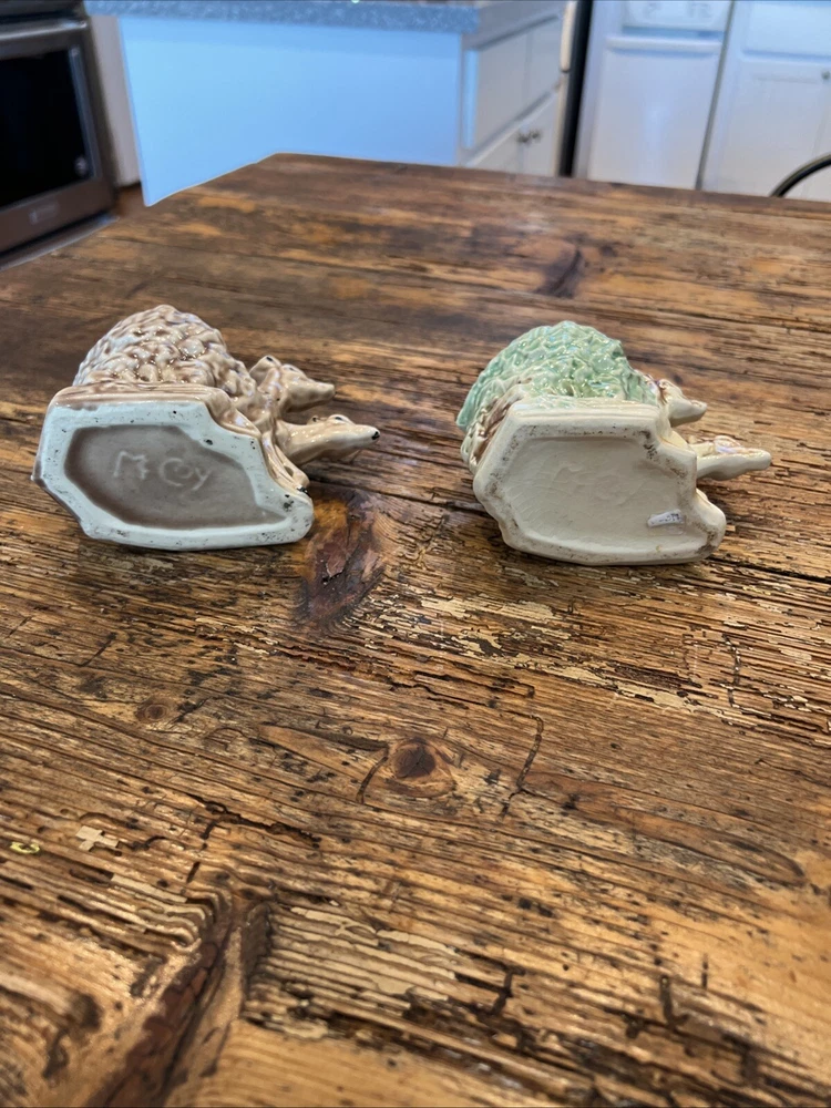 This pair of vintage planters from McCoy features a brown and green glaze with a deer and fawn design. The planters are made of clay and have a impressed backstamp. They were produced in 1957 and are in the Mid-Century Modern style. The planters are 4 1/4" in height and 6" in width and weigh 11 oz. They are original and have a production style of art pottery. These planters are perfect for indoor use and are a great addition to any collection. The green brown planter has a rim chip otherwise very good condition with no other chips or cracks.