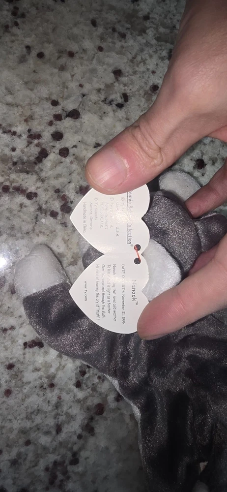 The Ty Beanie Baby Nanook is an original plush toy from 1996, featuring PVC pellets as opposed to the more commonly used plastic beads. This collectible item comes with its original tags, adding to its value for collectors and enthusiasts. As part of the Ty brand's line of Beanie Babies, this Nanook plush toy is a sought-after addition to any toy collection, appealing to fans of nostalgic and classic toys.