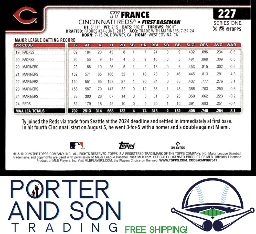 Absolutely love this Ty France card—clean design, sharp edges, and arrived in perfect condition thanks to the protective sleeve and top loader. The seller ships fast and securely, making it a breeze to add to my collection. Great for any Reds or France fan!