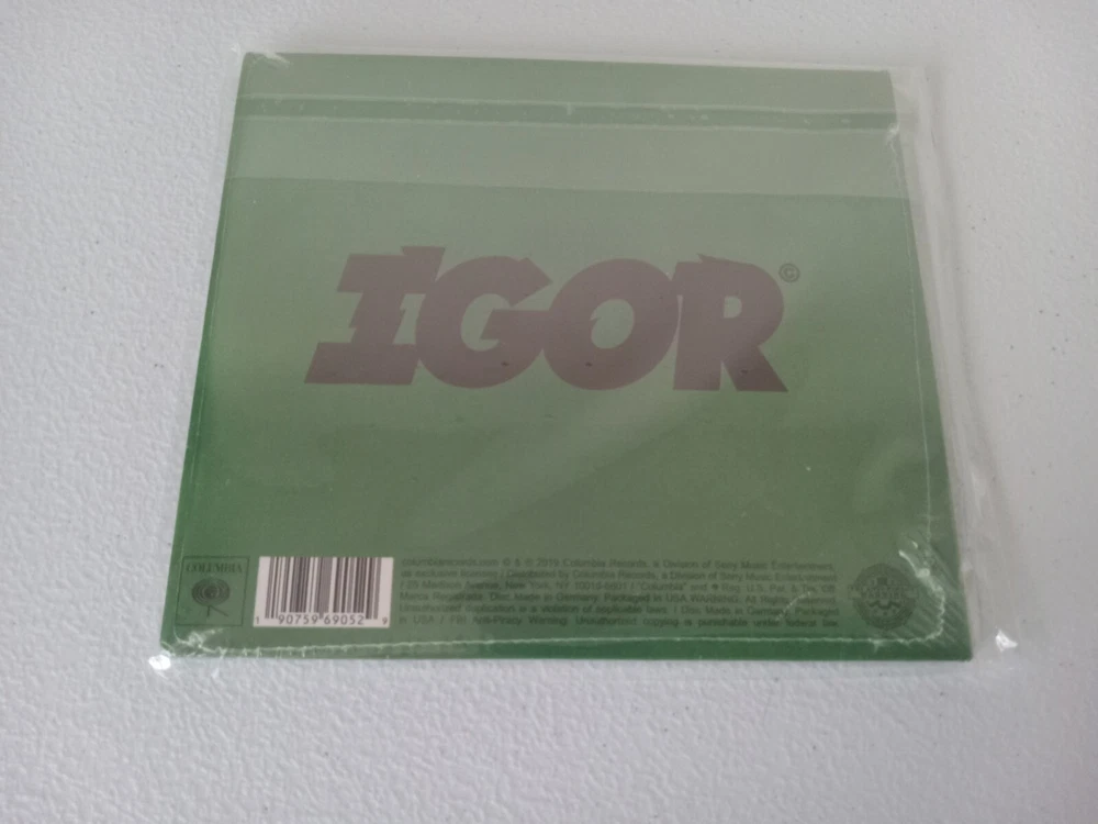 (CD) (NEW & SEALED) CASE (NM) Please view all pictures and if more are needed, just let me know! OFFICIAL MERCHANDISE Tyler, The Creator – Igor CD Album Limited Edition Green Cover Limited edition CD available by preorder only. Tracklist 1 Igor's Theme 3:20 2 Earfquake 3:10 3 I Think 3:32 4 Boyfriend 4:00 5 Running Out of Time 2:57 6 New Magic Wand 3:15 7 A Boy is a Gun 3:30 8 Puppet 2:59 9 What's Good 3:25 10 Gone, Gone / Thank You 6:15 11 I Don't Love You Anymore 2:41 12 Are We Still Friends? 4:25