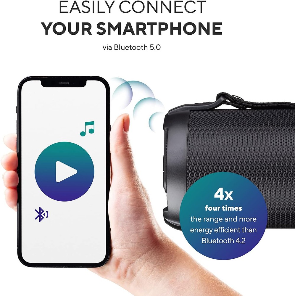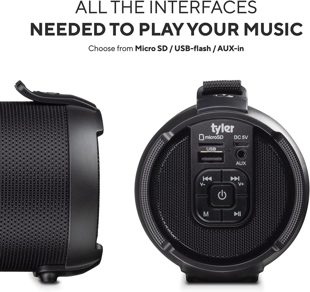 Tyler Wireless Bluetooth Speaker Water Resistant Long Range Rechargeable Boombox USB MP3 Micro SD AUX Inputs Fm Radio Sound & Bass Carry Strap Lightweight for Home Outdoor Stereo Product Details Mounting Type: Plug Mount,Strap Mount Model Name: TWS404-BK Speaker Type: Outdoor Special Feature: Waterproof Recommended Uses For Product: Music,Pool,Outdoor,Beach Compatible Devices: Smartphone, Tablet, MP3 Player, Desktop, Laptop Controller Type: Battery Powered Surround Sound Channel Configuration: 2.1 Included Components: Built-in carrying handle Product Dimensions: 9.8"D x 4.1"W x 3.6"H Item Weight: 0.77 Kilograms Impedance: 4 Ohm Is Waterproof: TRUE Number of Items: 1 Control Method: App Wireless Communication Technology: Bluetooth Speaker Size: 2.5 Inches Power Source: Battery Powered Audio Driver Type: Dynamic Driver Connectivity Protocol: Bluetooth, USB Includes MP3 player?: Yes Number of Power Levels: 1 Specific Uses For Product: Pool, Outdoor, Beach UPC: 712131666467 Manufacturer: TYLER Item Weight: 1.7 pounds Item model number: TWS404-BK Brand: TYLER Speaker Maximum Output Power: 100 Watts Connectivity Technology: Bluetooth, Auxiliary, USB Audio Output Mode: Surround, Stereo Input Voltage: 3.7 Volts FEEL THE POWER: Our Tyler Bluetooth speaker comes equipped with 2.5" tweeter capable to product 100 watts of peak power and amplify 50W RMS at 4 OHM that provides a surround stereo sound production and extended bass so that you can feel your music.,WATER RESISTANT: Take it out by the pool or use it as a shower speaker. We had liquids in mind and of course the kids. Not designed for water submerging but can withstand light water splashes. Go the beach, rivers, dance in light rain, we go your covered!,ENDLESS CONECTIVITY: Jam packed with a wide range of connectivity. Bluetooth, USB, Micro SD, AUX Headphone Jack & Micro USB oh yes and FM Radio. Specifically designed for all music sources in mind. Now the question is when to connect not how to connect!,WIRELESS FREEDOM: Take it where you need it! Camping, walking, dancing, in your home, outdoors, our durable Bluetooth was designed for constant wear are tear so you can take it anywhere anytime! Also comes with a built in carrying handle for your comfort when your on the go!,BUILT IN ION BATTERY: No battery's? No problem, we have equipped our speaker with built-in 3.7V ION rechargeable battery's for your convenience. Roughly 3+ hours of wireless play time so that you will be able to take your jam anywhere without a power source.
