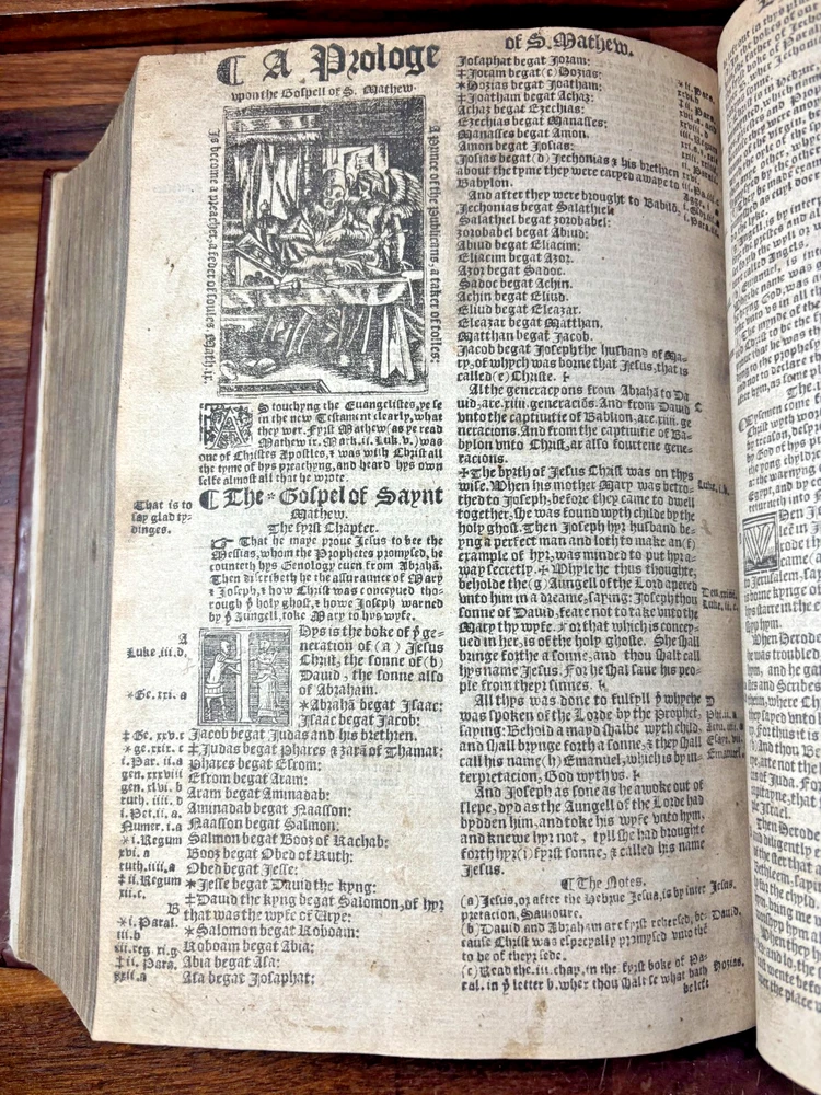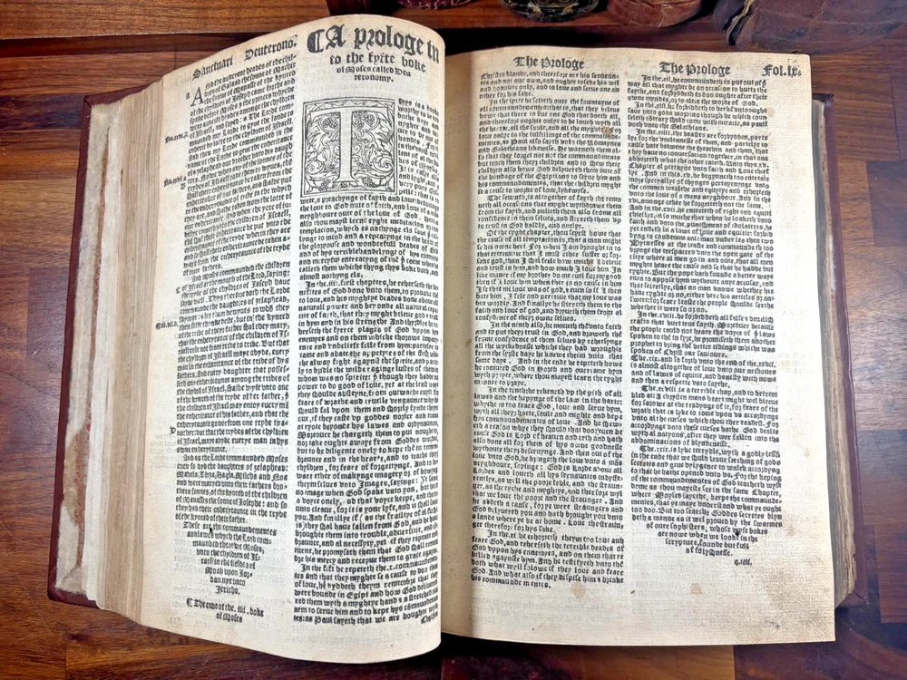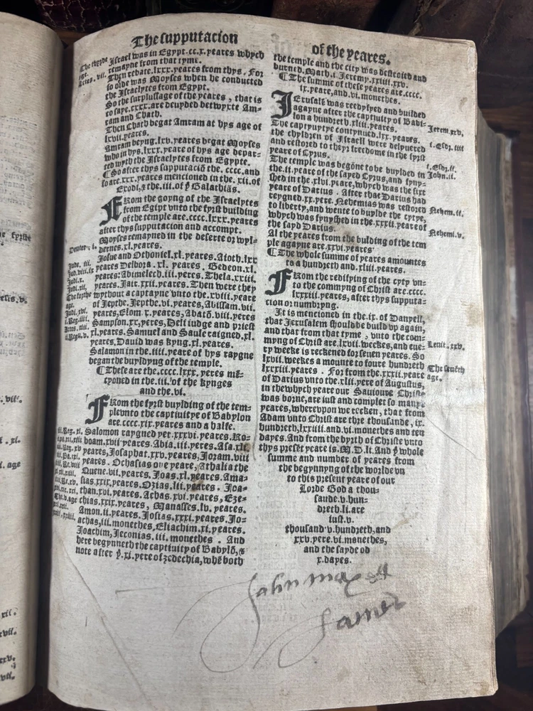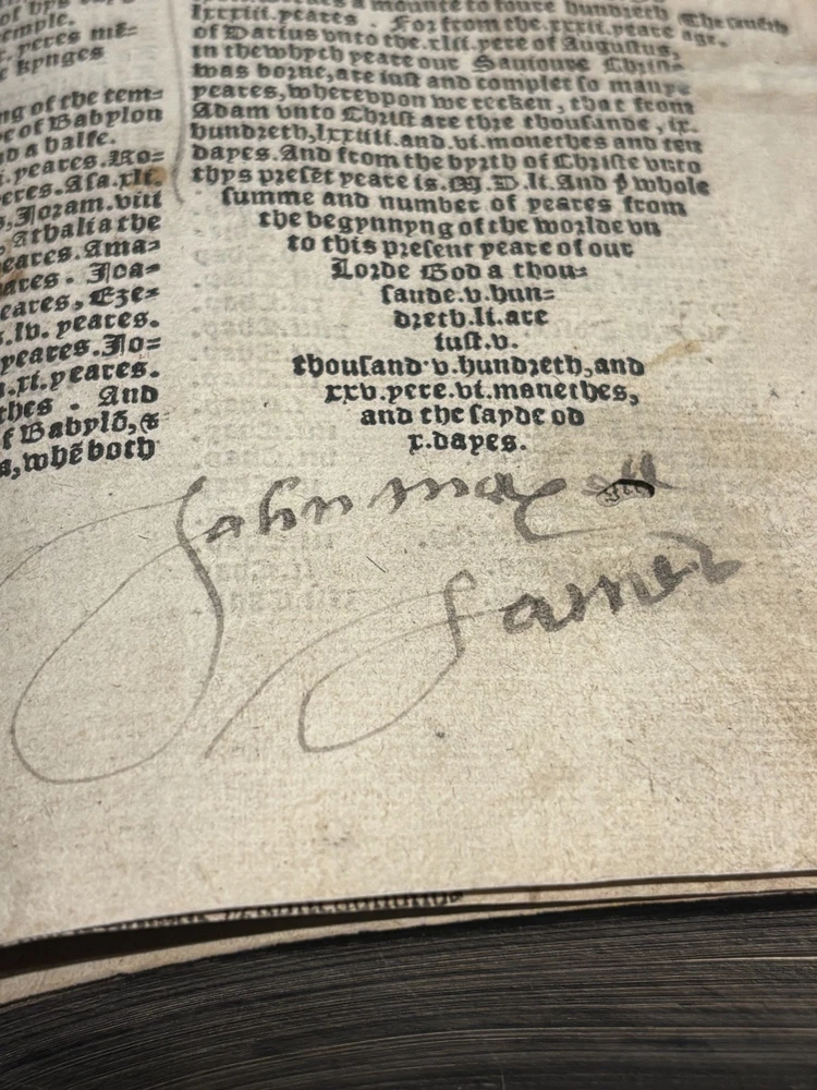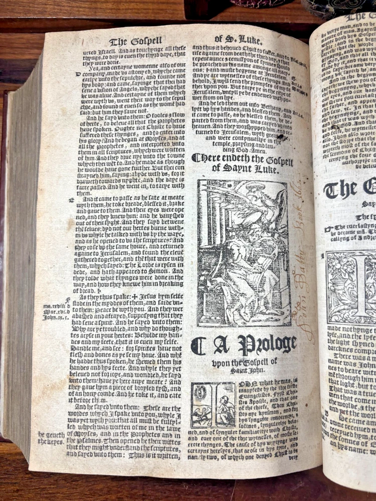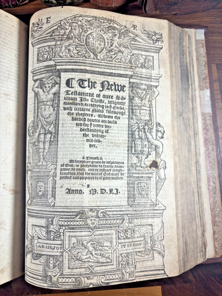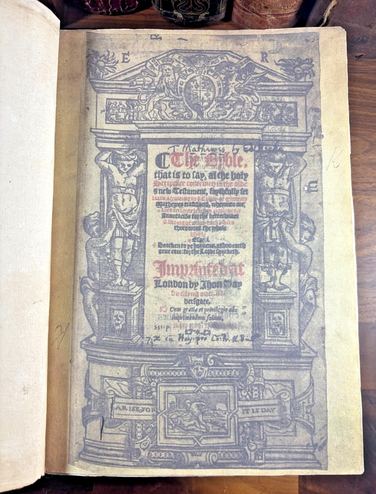 Tyndale Bible 1551 Small Folio Summary Presented for your review, a mid-sixteenth century English Tyndale small folio bible printed in London, England by John Day and William Seres. Description A large-format English bible in black-letter type, printed in London by the notable printers John Day and William Seres during the reign of Edward VI. The translation follows the Tyndale line and includes the Old Testament, Apocrypha and New Testament, each with its own woodcut title page and rich decorative elements. Text in double columns with numerous woodcut initials. Architectural borders prominently display the royal arms and the motto “Arise, for it is day.” A substantial and important edition reflecting the pivotal moment when the English bible, once forbidden, became officially supported within the Reformation. This particular bible was published during the reign of Queen Elizabeth I. It is a scarce opportunity to own a significant and rare piece of bible history. ___________________________________________________________________________________________________________________ History of the Tyndale Bible The Tyndale Bible marks one of the most decisive turning points in English religious and linguistic history. William Tyndale (c.1494–1536), educated at Oxford and Cambridge and ordained a Catholic priest in 1515, was the first to translate the New Testament into English directly from the original Greek, publishing it secretly in 1526. His mission was both spiritual and revolutionary: that every man, even “the boy that driveth the plough,” should have direct access to the Word of God. Tyndale’s translation was illegal in England; his books burned, his associates hunted but his words lived on, smuggled across the Channel and read in secret by merchants, artisans, and reformers. Arrested and executed in 1536 by the request of Henry VIII and carried out by the Holy Roman Emperor, he died praying that God would “open the King of England’s eyes.” Within a year, his prayer began to bear fruit. Tyndale’s phrasing shaped not only the Protestant faith in England but the future of English prose itself. His work provided much of the textual backbone for the Matthew Bible (1537) compiled by John Rogers, Tyndale’s friend and disciple, who later perished at the stake. Myles Coverdale’s additions and the patronage of reform-minded clerics such as Thomas Cranmer carried Tyndale’s words into the Great Bible of 1539, and later into nearly every English version thereafter. The printers John Day and William Seres, working under Edward VI, brought these texts into wide circulation, securing the place of vernacular Scripture at the heart of English worship. Through their presses, and through the testimony of figures like John Foxe, whose Book of Martyrs enshrined Tyndale’s sacrifice, the Tyndale Bible became not only a cornerstone of English Protestantism but a monument of the English language its cadences echoing still in the King James Version and the literary tradition that followed. ___________________________________________________________________________________________________________________ Collation Prelims : First 4 leaves including OT title page in facsimile. Old Testament Signatures: c2 to c6 e-i1 to e-i6 k-s1 to k-s6 (with unsigned leaves counted within gatherings) Second Section A-H1 to A-H6 K-T1 to K-T6 U1 to U3 Third Section A1 to A2 AA3 to AA6* (signature anomaly noted for bibliographic transparency) BB-II1 to BB-II6 KK-YY1 to KK-YY6 AAA1 to AAA6 BBB1 to BBB4 Books of the Apocrypha AAa1 to AAa6 BBb1 to BBb6 (BBb3 potential misprinted “BB3”) CCc-HHh1 to CCc-HHh6 JJj-OOo1 to JJj-OOo6 New Testament Aaaa-Hhhh1 to Aaaa-Hhhh6 Jjjj-Uuuu1 to Jjjj-Uuuu6 Total leaves: approximately 564 (Unsigned leaves included within gatherings; supplied facsimile prelims enumerated) Provenance / Inscriptions • Seventeenth-century marginalia in a neat early hand, chiefly in prophetic books (e.g., Ezekiel). These are short theological glosses employing the abbreviation viz. (“namely / that is to say”), clarifying passages concerning divine judgment and calamity. Example transcription: “viz. declares God’s judgment and how He scourgeth them…” Translation / sense: “Namely, this passage shows God’s judgment and how He punishes them.” Additional glosses reference themes such as pestilence, the sins of the people, and prophetic warnings, indicating active devotional study by an early reader. • Eighteenth–nineteenth-century ownership inscriptions in bold cursive, including: “John Mac…” (surname uncertain) and “James” , written across the lower margin of The Supputation of the Years leaf and lightly on the Apocrypha title page. These function as later possession notes rather than commentary. References Herbert 93 (provisional, pending final verification notes) Darlow & Moule 88 STC 2073 Condition • First four prelim leaves (including OT title) in facsimile • Rebound with a sympathetic cover approximately 20th century, retaining the earlier spine laid on • Leaves trimmed with some marginal losses near headlines • Expected toning, occasional small repairs, minor stains or edge wear • Text strong and largely clean • Woodcut initials and NT architectural border well preserved Dimensions Text block size approximately 245 mm x 155 mm Catalogue Note A highly significant mid-Tudor English bible printed during the crucial early decades of the Reformation, combining scarcity, historical value and a largely complete survival exceeding 560 leaves. ___________________________________________________________________________________________________________________ Significance and Appeal This bible is not merely a religious text but a witness to the birth of the English Reformation and the shaping of the English language itself. The editions printed by John Day and William Seres occupy a pivotal place in that history: they were among the first legally printed En