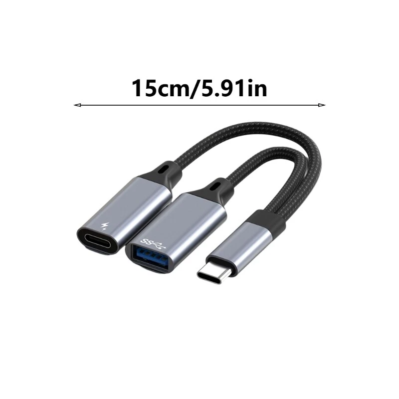 Features: Effortlessly connect your Type C devices to USB peripherals with this Type C to USB 3.0 Adapter, featuring a 30W PD charging port for simultaneous power and data transfer. This adapter boasts USB 3.1 Gen1 standard, ensuring up to 10 Gbps data transfer speed while maintaining backward compatibilities with USB 3.0 and 2.0. Ideal for individuals using devices and other USB C compatible gadgets search smooth connection . Perfect for on the go professionals needing to connect USB flash drives, keyboards, or mices to laptops and tablets during meetings, travel, or remote work setups. Crafted from aluminum, this Small 15cm OTG cable is designs to enhances device 's functionality without compromising on style or portability. Note: The Type C female interfaces supports only charging but not data transmission. Specifications: Material: aluminum Length: about 15cm/5.91inch Package Includes: 1xOTG Cable note: Please allow 1 to 3cm error due to manual measurement, please make sure you not mind before you bid, Due to the differences between different monitors, the picture may not reflect the actual colorful of the item.
