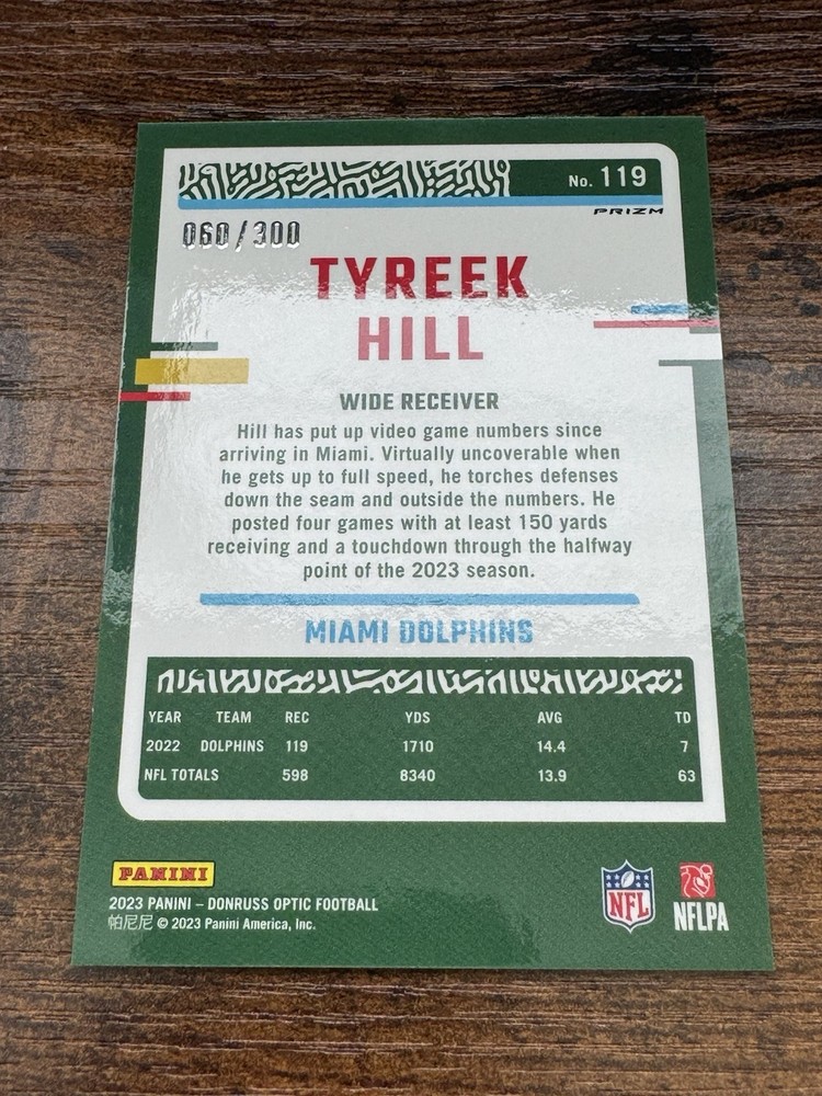Elevate your Tyreek Hill collection with the 2023 Panini Donruss Optic Premium Silver Wave card, numbered #60/300. This limited edition piece, card number 119 from the set, captures the dynamism of the Miami Dolphins' star player in a stunning Silver Wave parallel. A must-have for football enthusiasts and collectors alike, this card boasts an array of features including a hologram, insert, and the much-coveted serial numbering. Crafted with care by Panini, this trading card is a testament to Hill's prowess on the field and is a valuable addition to any NFL collection. Its exclusivity is further enhanced by its short print run, making it a unique treasure that resonates with the spirit of the sport. This card is a celebration of athletic greatness and a standout piece in the 2023 Panini Donruss Optic series.