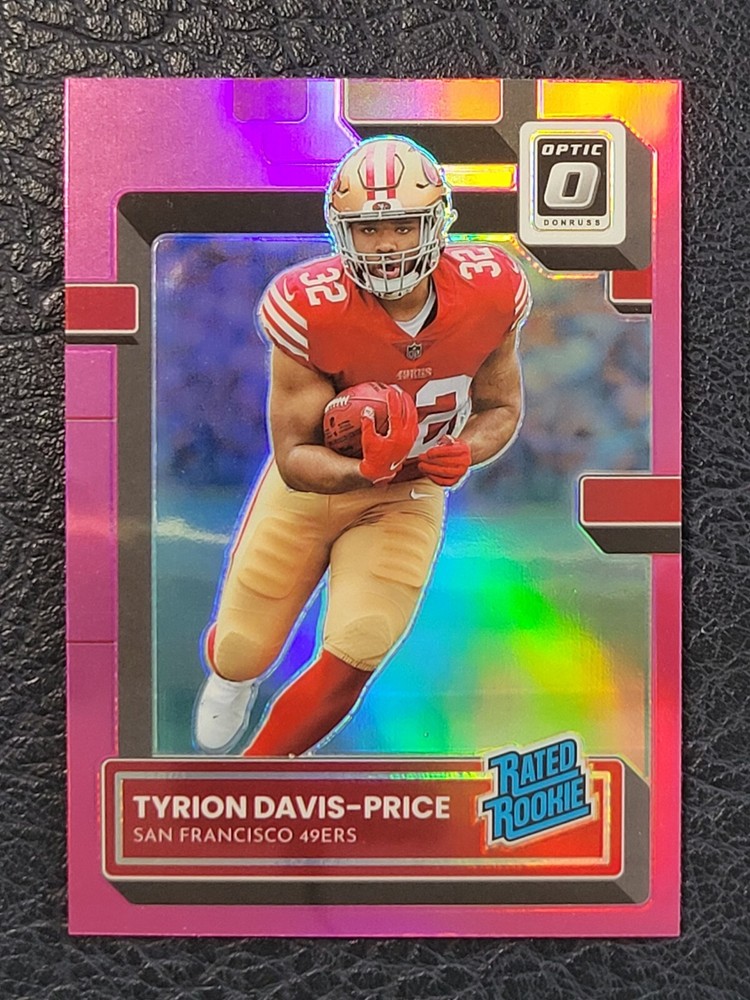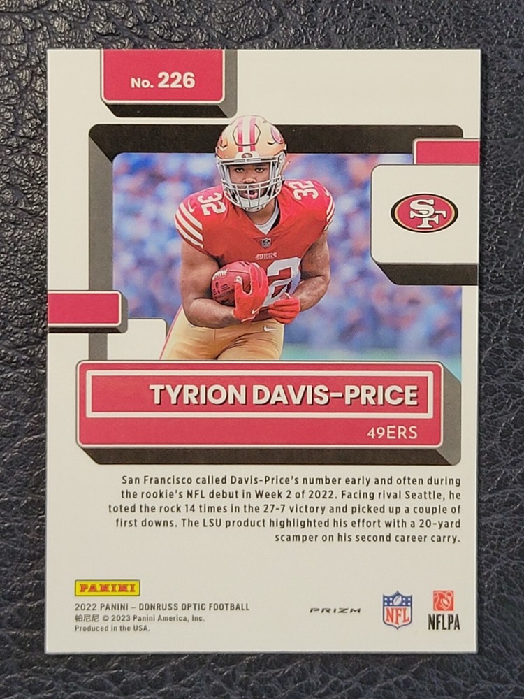 This Tyrion Davis-Price 2022 Panini Donruss Optic Pink 226 and Select Premier 187 Green Yellow Rookie card pair (2) is a must-have for any avid collector. With its standard size and card stock material, this card duo is a great addition to any collection. Featuring a parallel and insert design, this card set is sure to stand out from the rest. As a fan of the LSU Tigers, San Francisco 49ers, and Philadelphia Eagles, this card is a unique piece of memorabilia that any fan would love to have. Don't miss out on the opportunity to add this rare card to your collection.