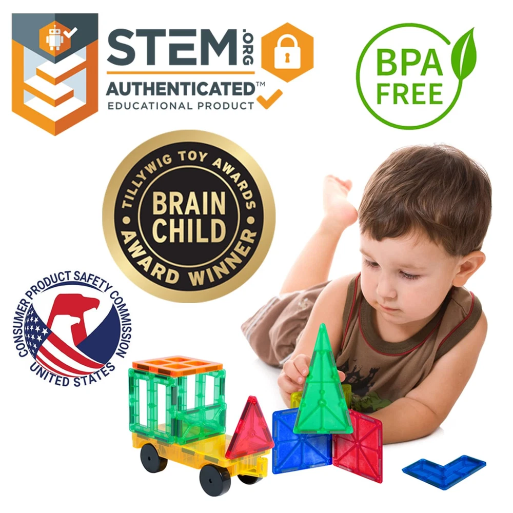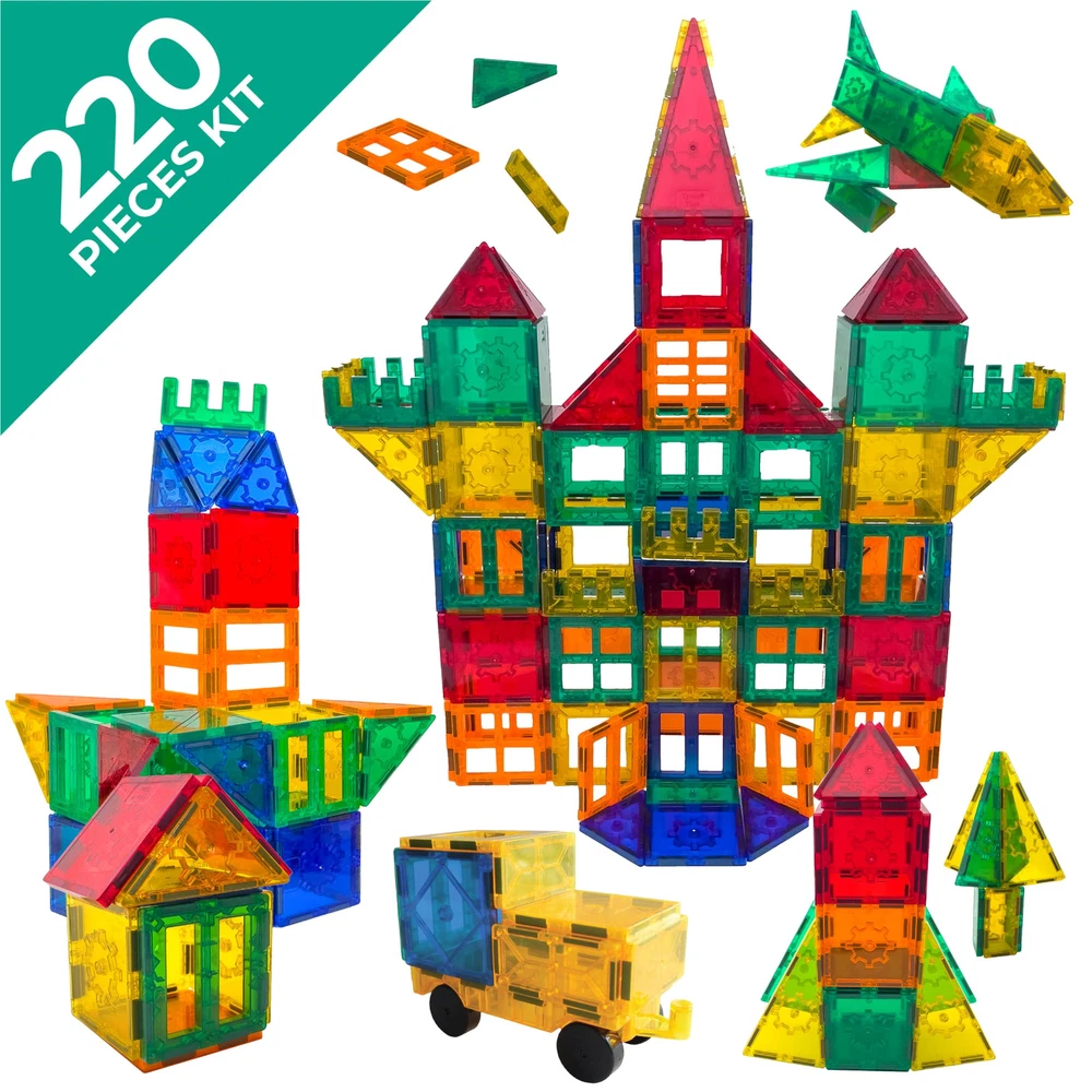With 220 tiles of various shapes and sizes, kids can build anything their mind imagines through innovative play. With a simple click, these magnetic learning tiles can bring to life 1000s of different creations and dreams. This amazing set features a wide variety of striking colors and shapes including triangles, squares, rectangles and more! Tiles can be crafted into large 3D buildings, castles, and various vehicles. Children will get to explore their IMAGINATION and fine-tune their MOTOR SKILLS. Every Tytan Tiles magnetic kit is certified by STEM.org as an educational tool to help develop STEM (Science, Technology, Engineering, and Mathematics) skills. Kids will get work with SHAPE AND PATTERN RECOGNITION, MAGNETIC PRINCIPLES, and ARCHITECTURAL BUILDING. The 220-piece kit from Tytan Tiles is made from environmentally friendly materials, is parent-tested, and has the highest level of CPSA child safety certifications. INCLUDES: 1 Tytan Tiles 220-Piece Magnetic Building Set, which features 45 Squares, 20 Hollow Squares, 30 Right Triangles, 15 Tall Triangles, 20 Rectangles, 50 Equilateral Triangles, 15 Two Pane Windows, 10 Four Pane Windows, 15 Castle Battlements, and 1 Design Inspiration Booklet. With 220 tiles of various shapes and sizes, kids can build anything their mind imagines through innovative play. With a simple click, these magnetic learning tiles can bring to life 1000s of different creations and dreams. This amazing set features a wide variety of striking colors and shapes including triangles, squares, rectangles and more! Tiles can be crafted into large 3D buildings, castles, and various vehicles. Children will get to explore their imagination and fine-tune their motor skills. Every Tytan Tiles magnetic kit is certified by STEM.org as an educational tool to help develop STEM (Science, Technology, Engineering, and Mathematics) skills. Kids will get work with shape and pattern recognition, magnetic principles, and architectural building. This 220-piece kit from Tytan Tiles is made from environmentally friendly materials, is parent-tested, and has the highest level of CPSA child safety certifications. Includes: 1 Tytan Tiles 220-Piece Magnetic Building Set, which features 45 Squares, 20 Hollow Squares, 30 Right Triangles, 15 Tall Triangles, 20 Rectangles, 50 Equilateral Triangles, 15 Two Pane Windows, 10 Four Pane Windows, 15 Castle Battlements, and 1 Design Inspiration Booklet. Perfect present for kids 3 and up. Give the gift of creativity and STEM/STEAM education. An everyday gift that allows roleplay with figures, markers, and stickers. Click 'Add to Cart' now!