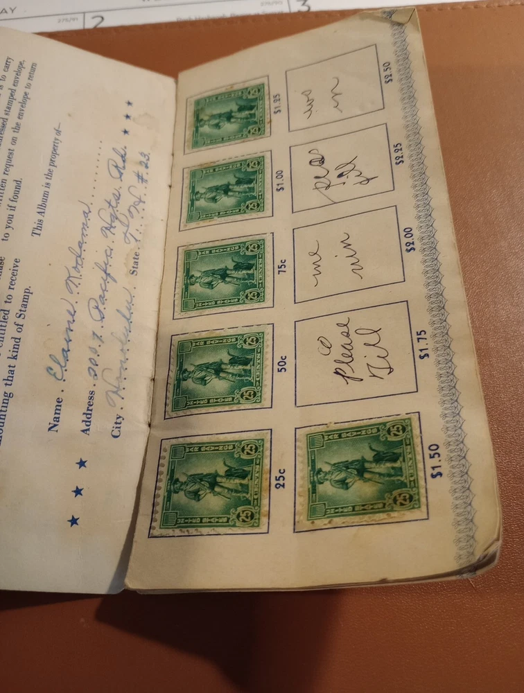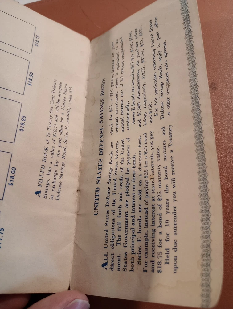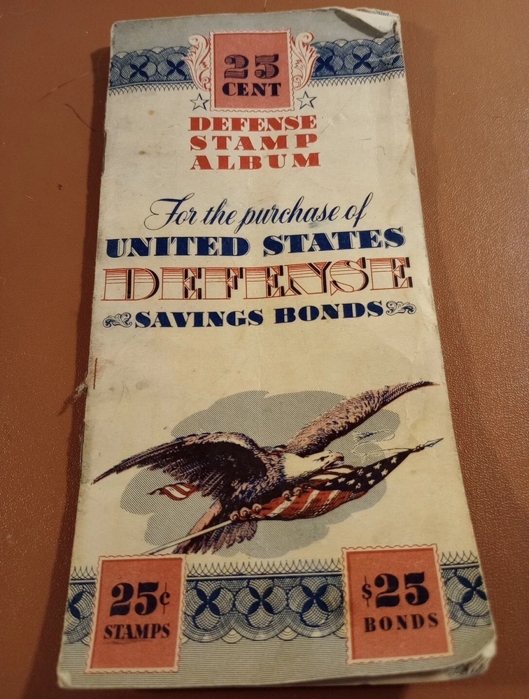 25 cent defense stamp album used for United States defense savings bonds with 6/ 25c stamps in booklet