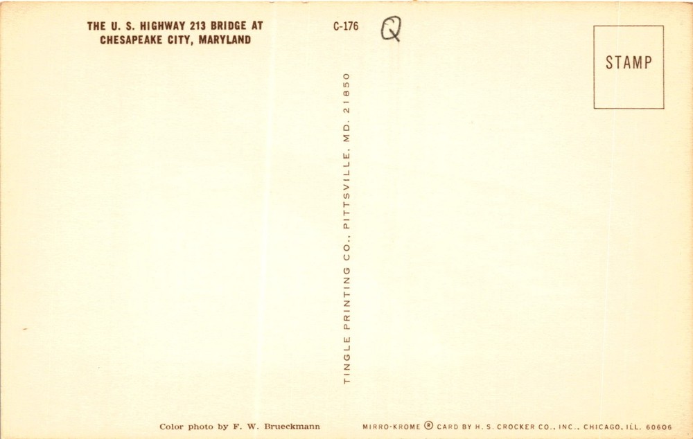 MAKE AN OFFER. THE MORE YOU BUY THE BETTER DEAL I WILL ACCEPT The postcard features a color photo of the U.S. Highway 213 Bridge in Chesapeake City, Maryland. The image was taken by F. W. Brueckmann and printed by Tingle Printing Co. in Pittsville, MD. The postcard is a Mirro-Krome card produced by H. S. Crocker Co., Inc.