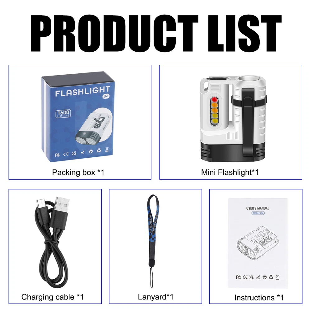 Product Description [Product description] Compact Size : The flashlight is designed as a portable, miniature keychain model for easy carrying. High Brightness : It offers 1600 lumens of floodlighting for effective illumination. Wide Beam Spread : Features a 175° beam angle for extensive coverage. Easy Charging and Attachment : Includes two-way magnetic charging and a Type-C clip for versatile use. Rugged Build : IP68 rated for dust and water resistance, suitable for tough environments. [Product Features] Model : U6 Color : Classic black and white, stylish and simple Material : 6061 Aluminum alloy with hard anodized treatment, reinforced with ABS, wear-resistant and durable Light Source : 6 x SST20-10W high-brightness LEDs + 5 x domestic 3030 beads, 20W high power Luminous Flux : Ultra-bright mode up to 1600 lumens, with multiple brightness options from 200 lumens to 800 lumens Color Temperature : 6500-7000K, close to natural light Color Rendering Index (CRI) : 75, high color reproduction Endurance : Up to 50 hours in dimmest mode, 1 hour and 30 minutes in ultra-bright mode Water Resistance : IP68 rated, fearless of rain, suitable for various harsh environments Charging Method : Type-C smart charging, 2.5 hours for a full charge, with clear charging status indicators [Multifunctional Design] Multi-Light Source Modes : White light, warm light, red light, and red flash, meeting the needs of different scenarios Multi-Brightness Adjustment : Economic, low, medium, high, ultra-bright, strobe, switch with one touch Easy Operation : Long press, short press, double click, easily control various modes 180° Rotatable Clip : Rotatable design, convenient to carry on pockets, backpacks, etc. Magnetic Attraction : Strong magnet at the bottom, can be firmly attached to any iron surface [Smart Charging and Battery Indicator] Type-C Charging Port : Widely compatible, more convenient for charging Battery Indicator : Green light indicates full charge, red light suggests low battery, smart battery management [Application Scenarios] Outdoor adventures, camping, hiking Emergency lighting Daily maintenance, reading Car backup, safety escape [Package Contents] U6 Keychain Flashlight x1 0.5m Type-C Charging Cable x1 High-quality portable lanyard x1 Exquisite packaging box x1 Detailed instruction manual x1 . Payment Shipping Terms Returns Contact Us We accept PayPal only. If buyer want to delay the payment because of financial problem, please contact me by the ebay message within 3 days Payment via PayPal (PayPal accepts all major credits/debit cards and eCheque) ECheque payment will tak e 3-10 days to get clear, thus DELAYing the shipment. Handling time: 1 business day (Orders are not processed on weekends & holidays) Tracking information will be sent once item is shipped. Local pick-up is unavailable at the moment. For international shipping and shipping to Guam, Hawaii and Alaska, Please contact us before placing the order. Item is shipped to ebay address. Leaving correct address can minimize delay. For any issues with Defects, Return, Item Exchange request, please contact us first and send us a message first before opening any type of case or request. We devote ourselves making EVERY CUSTOMER in 100% Satisfactory and resolve any problem. We highly value and appreciate your business. Thank you. No returns will be accepted without an RMA number. Please contact us for the RMA number. Return is acceptable within 30 days of delivery. Return for replacement or money back is optional. Returned items must be in the brand new, unaltered and resalable condition. Seller is not responsible for any labor cost, expense in a dealer store, or damage due to wrong installation. Return is accepted within 14 days after the buyer's receiving the item. (Excluding contrived damagement or misusage).100% money-back Guaranteed! All product will be tested in 100% before delivery.If the item is defected by the processing of postage,Buyer has up to 14 days from date of receipt for exchange of a new one.All shipping charges for returned products are to be paid by the buyer,Please contact us for the return address All messages will be answered within 24 office hours. Please contact us either by clicking "contact seller" in the "purchase history" section or simply click "ask a question" at the bottom of this page. If you are unsatisfied with our item or service, please contact us before leaving any feedback. We are committed to resolve all issues in a friendly and satisfactory manner. We always reply to messages within 2 business days (off-duty at weekend). If you do not get a response from us, then please check your junk or spam mailbox. Payment We accept PayPal only. If buyer want to delay the payment because of financial problem, please contact me by the ebay message within 3 days Payment via PayPal (PayPal accepts all major credits/debit cards and eCheque) ECheque payment will tak e 3-10 days to get clear, thus DELAYing the shipment. Shipping Handling time: 1 business day (Orders are not processed on weekends & holidays) Tracking information will be sent once item is shipped. Local pick-up is unavailable at the moment. For international shipping and shipping to Guam, Hawaii and Alaska, Please contact us before placing the order. Item is shipped to ebay address. Leaving correct address can minimize delay. Terms For any issues with Defects, Return, Item Exchange request, please contact us first and send us a message first before opening any type of case or request. We devote ourselves making EVERY CUSTOMER in 100% Satisfactory and resolve any problem. We highly value and appreciate your business. Thank you. No returns will be accepted without an RMA number. Please contact us for the RMA number. Return is acceptable within 30 days of delivery. Return for replacement or money back is optional. Returned items must be in the brand new, unaltered and resalable condition. Seller is not responsible for any labor cost, expense in a dealer store,