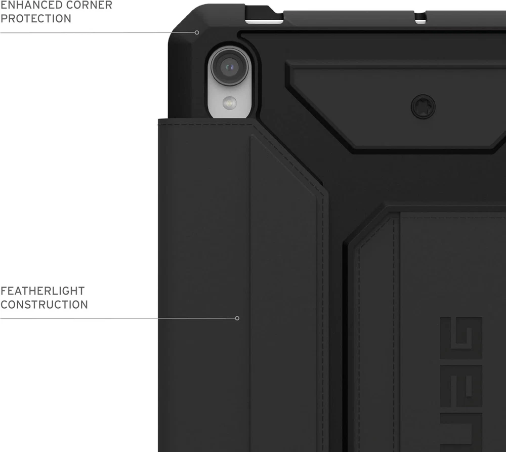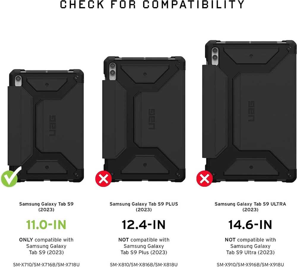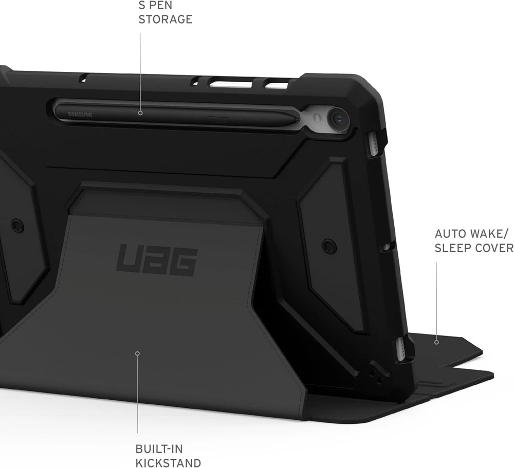 UAG Designed for Samsung Galaxy Tab S9 Case 11" 2023 SM-X710 Metropolis Black Product Details Brand: URBAN ARMOR GEAR Color: Black Compatible Devices: Tablets, Cameras, Laptops Form Factor: Case Shell Type: Soft LIGHTWEIGHT CONSTRUCTION: Our Samsung Galaxy Tab S9 case features a featherlight composite construction, a soft impact-resistant core, and enhanced corner protection providing top-of-the-line protection to withstand rugged conditions. ADJUSTABLE KICKSTAND: Auto wake/sleep folio cover that doubles as a multi-angle viewing kickstand to transform your tablet into a laptop with comfort and ease. Smooth to the touch exterior made with PU material provides both a great in-hand feel and a secure grip. Folio cover can withstand the use of daily cleaning wipes PRECISE FIT: Precise cutout with easy and full access to all buttons and ports. Soft-raised screen surround bezel to protect touchscreen and camera. S PEN STORAGE & PORTABILITY: Built-in S Pen holder and S Pen magnetic charging access. Shoulder strap tether anchor points for added portability (shoulder strap and stylus tether NOT included). MILITARY DROP PROTECTION: Meets Military drop-test standards (MIL STD 810G 516.6) Metropolis SE Series features a tough and rugged silhouette that provides your tablet with unbeatable protection. Featuring a featherlight composite construction and a soft, impact-resistant core to shield your tablet from serious drops from serious heights. Impact-resistant corners to shield your tablet from scratches and dents from accidental drops or falls. The folio cover doubles as a multi-angle stand to transform your tablet into a laptop with ease quickly. Soft touch and smooth PU exterior that can withstand the use of daily cleaning wipes. Thoughtful shoulder strap tether anchor points for the use of an adjustable shoulder strap (shoulder strap and stylus tether NOT included) for when your tablet is not in use or for transport. The perfect case for kids and people that rely on their tablets on the go.