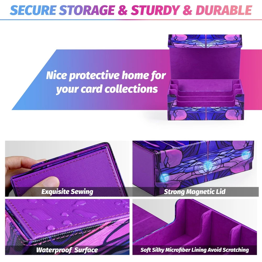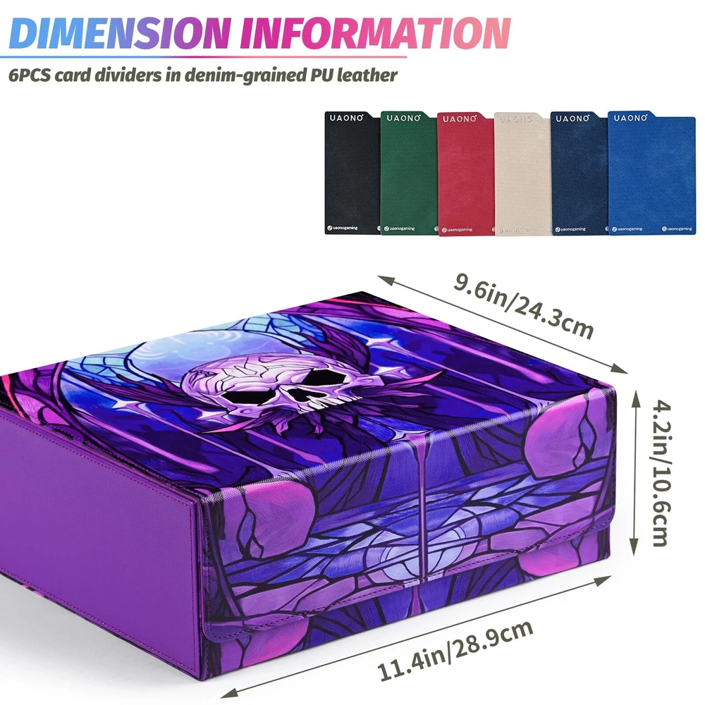 1 Super Large Capacity - The card storage box can easily accommodate over 2400 loose trading cards. It is also suitable for storing 1050+ double-sleeved cards or 1800+ single-sleeved cards, but not compatible with cards in top-loaders or cards held by magnetic card holders. Accessory: 6Pcs card dividers Durable Material - Our trading card box is made of premium leather and soft ultra-fine fiber lining, effectively preventing cards from scratches and keeping them in pristine condition. The high-quality materials and exquisite craftsmanship ensure its extremely long service life. You can enjoy the fun of collecting various favorite gaming cards and sports cards to your heart's content Stylish Appearance with Magnetic Closure - The strong magnetic closure ensures that the card storage box won't open even when shaken hard, preventing cards from falling out. The exterior features a beautiful textured finish, providing not only excellent protection but also adding a touch of style to your cards Versatile Uses - The UAONO card box is sturdy in structure, multifunctional, and offers ample storage space to meet all gaming needs. Perfectly compatible with various collectible card games such as Magic The Gathering, Duel Masters, sports cards, etc. If you need a new card storage solution, this box is definitely an ideal choice Excellent Choice - It is a nice choice for friends and family who enjoy collecting cards, providing a dedicated home for your cards