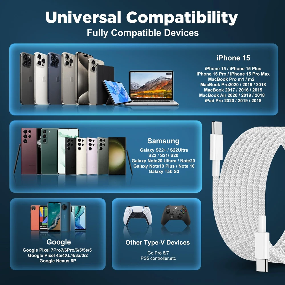 UCALMA USB C to USB C Cable 6FT+10FT 2Pack 60W iPhone 15 Charger Cord Long Type C to C Cable Fast Charging for Apple iPhone 15/Pro/Pro Max/Plus/iPad Pro Air/MacBook/Air/Mini/Samsung Galaxy S24/S23 2Pack 60W USB C to C Cable Fast Charging for iPhone 15/15 Plus/15 Pro/15 Pro Max Parameter information: Max Output: 60W=20V 3A Data transfer: 480Mbps Length: 6FT+10FT Transfer movies, music, or an entire photo library in seconds with 480 Mbps transfer speeds. Support 60W max output for charging phones, tablets, and laptops. The super long type c extension cable lets you charge and have fun in the bedroom, sofa, library, and office, even in the backseat of the car. [MFi Certified] Protect the charging port of your expensive device from damage, the metal end is never broken [Super Fast Charging] Fast charge most USB-C laptops, tablets, and cellphones to 50% in only 30 mins, great for iPhone 15/15 Pro/15 Plus/15 Pro Max, Samsung Galaxy, and Google Pixel PPS super fast charging. [Superior Durability] Lasts 30x longer than ordinary TPE proven in a laboratory environment to withstand 20000 bends, resulting in a longer lifespan compared to ordinary TPE fast charging cord type c. [Superior Safety] Premium copper wire core provides greater charging stability and higher efficiency, protecting against overheating, overcharging, and short circulation. Universal Compatibility MacBook and USB C Laptop: MacBook Retina 12 inch MacBook Air(intel 2017. intel 2020, M1, M2) MacBook Pro 13 14 15 16 inch 2023, 2022 2021 2020 2019 2018 2017 2016 Surface(Use USB C charging port), Dell, Lenovo, HP,and More iPad: iPad Pro 12.9 inch 6th 5th 4th 3rd generation iPad Pro 11 inch 4th 3rd 2nd 1st iPad Air 5th 4th/ iPad Mini 6 /iPad 10/and More iPad 10th iPad Mini 6th Cellphone: iPhone 15/iPhone15 Plu/iPhone15 Pro/iPhone15 Pro Max Samsung Galaxy S24 / S24+ / S24 UltraS24 / S23+ / S23 Ultra / S22 / S22+ / S22 Ultra / S21 / S21+ / S21 Ultra / S20 / S20+ / S20 Ultra/Samsung Note 20 / Note 20 Ultra / Note 10 / Note 10 Plus... Google Pixel 7 Pro/7/ 6a/6 Pro/6 LG, Moto/Fire HD 10/8 tablet/and More 【60W Super Fast Charging Cable and Data Sync】This USB C to USB C fast charging cable Max output up to 20V/3A, Fast charge of USB-C devices, such as most iPad, laptops and mobile phones, up to 50% in as little as 30 minutes, USBC to USBC cable for iPhone 15, 15Pro, 15Plus, 15Pro Max, Samsung Galaxy, and Google Pixel PPS super-fast charging, and it supports 480Mbps high-speed data transfer. 【Compatible Devices】This USB-C to USB-C cable is compatible with virtually all USB-C devices including phones, tablets, and laptops.fast charging USB C cable compatible with iPhone 15/iPhone 15 Pro/iPhone 15 Pro max/iPhone 15 Plus/MacBook Air 13inch/MacBook Air 2018, Mac Book Retina 12 inch/MacBook Pro 2016 and late, iPad Pro 12.9 inch/6th/5th/4th/3rd generation, iPad Air 5th 4th, iPad Mini 6, iPad 10th, Samsung Galaxy S24, S24+Ultra,S23, S22, S21, S20, S10, Google Pixel 7 Pro, 7, 6a, 6 Pro, 6. 【Safe and Reliable】The iPhone 15 charging cable 6ft+10ft meets electronic safety certification; the smart chip automatically matches the current required by your mobile device for fast, secure, and stable charging of iPhone and iPad devices; and it automatically stops charging after a full charge to ensure safe charging and prolong service life. 【Superior Durability】Our nylon-braided type c to type c fast charging cable has a premium nylon-braided exterior with pure copper wires inside, laser-welded so the metal end is never broken. The premium copper wire core provides you with greater charging stability and higher efficiency, protecting against overheating, overcharging, and short-circuiting. With a 20,000+ times bend test, this is sturdy and durable. 【Quality Service】You will get 2 packs of different-length long USB C to USB C cable 10ft+6ft which can be used for larger spaces. We offer a 24-month worry-free warranty and 24/7 friendly customer service. Shipping from the USA All of our products are shipped from the USA, ensuring quick delivery to your destination. Payment We offer the following payment methods: PayPal, credit card, bank transfer, and eBay's secure payment system. Free Shipping & Free Returns Shipping within the USA is FREE. Additionally, any return is absolutely free for you. Risk-Free Purchase You have the option to return an item within 30 days without any justification. We cover the return shipping costs! Fast Shipping We ship immediately upon receipt of payment. Generally, the package is delivered within 2-3 days in the USA. If it takes longer, we will contact you. Quality and Costs Made in Europe, USA, China No customs fees or additional charges Total satisfaction guarantee Invoice with declared VAT available upon request in .pdf format Feedback Your feedback is very important to us. After you pay for your purchase, you will automatically receive positive feedback from us.