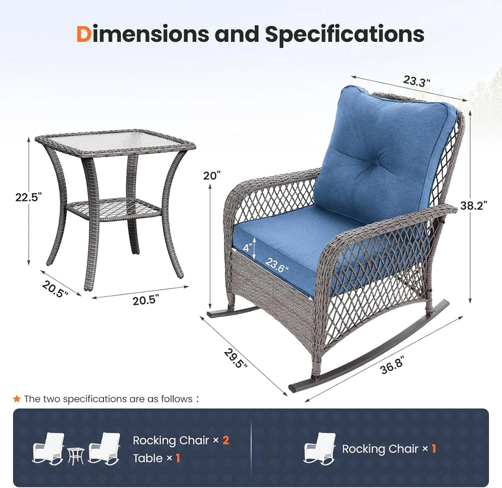 Brand: UDPATIO Size: 3PCS Set Color: 2-3pc-grey/Navy Assembly Instructions Description: Assembly required, instructions provided Item model number: patio-rocking-chairs UPC: 7445030150159 Style: Modern Manufacturer: UDPATIO Set Name: 3-Piece Set Country of Origin: China Type: Does not apply gtin13: 7445030150159 Product Dimensions: 24.8 x 24.8 x 36.6 inches Material: Does not apply Special Feature: Cushion Availability, Easy to Carry, Smooth Rocking, UV-Resistant Item Weight: 86 Pounds