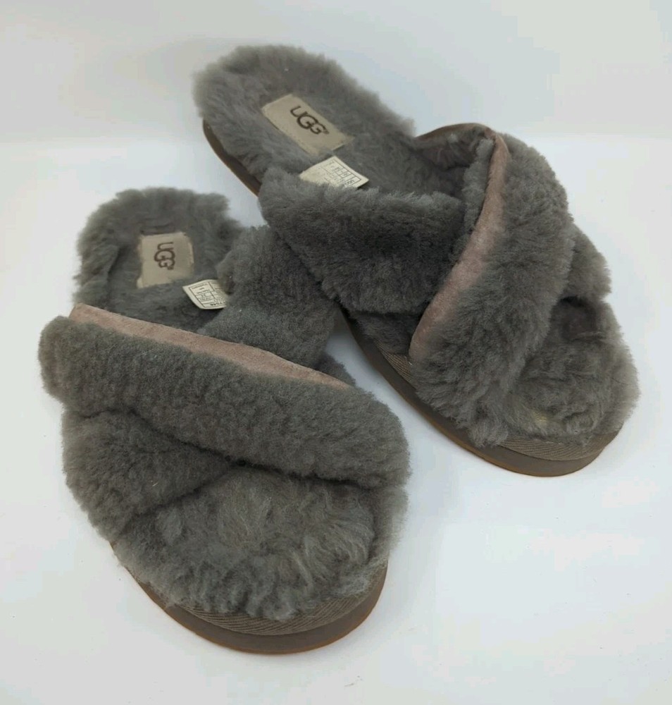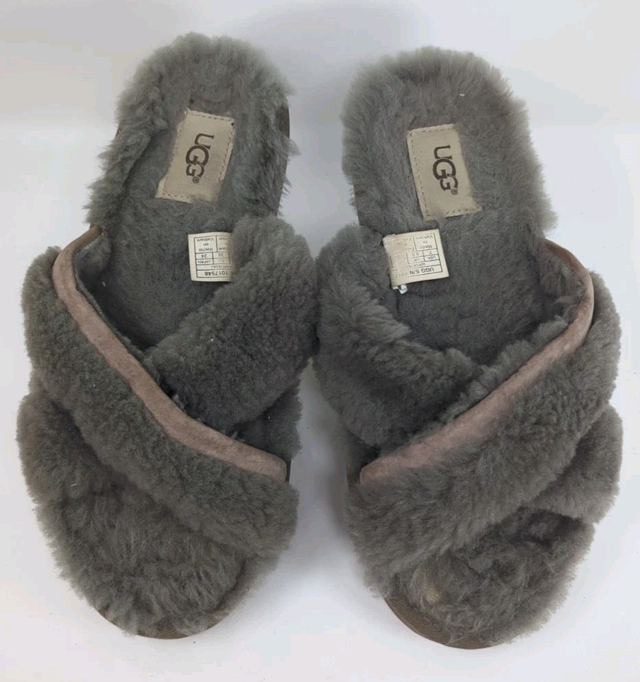 UGG ABELA FLUFFY SHEEPSKIN STREET FRIENDLY SLIPPERS / SLIDES SLATE GREY IN COLOR US WOMENS SIZE 7 / EURO 38 For both indoor and outdoor use Fluffy sheepskin uppers Genuine sheepskin sock liner that naturally wicks away moisture and helps keep your feet dry, warm and cozy Lined with sheepskin Street friendly rubber sole