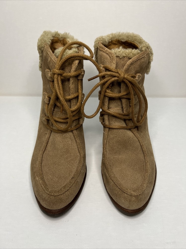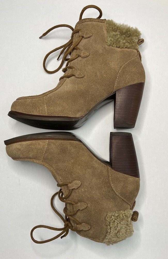 Step up your boot game with these stylish UGG Australia Analise ankle boots! Made with high-quality nubuck leather and a soft shearling cuff, these boots will keep you warm and fashionable all winter long. The lace-up closure ensures a secure fit, while the solid beige color and fur trim accents add a touch of elegance to any outfit. Perfect for casual wear, these boots are a must-have addition to your wardrobe.