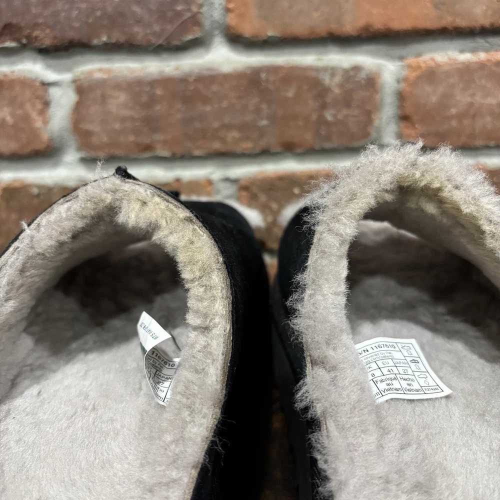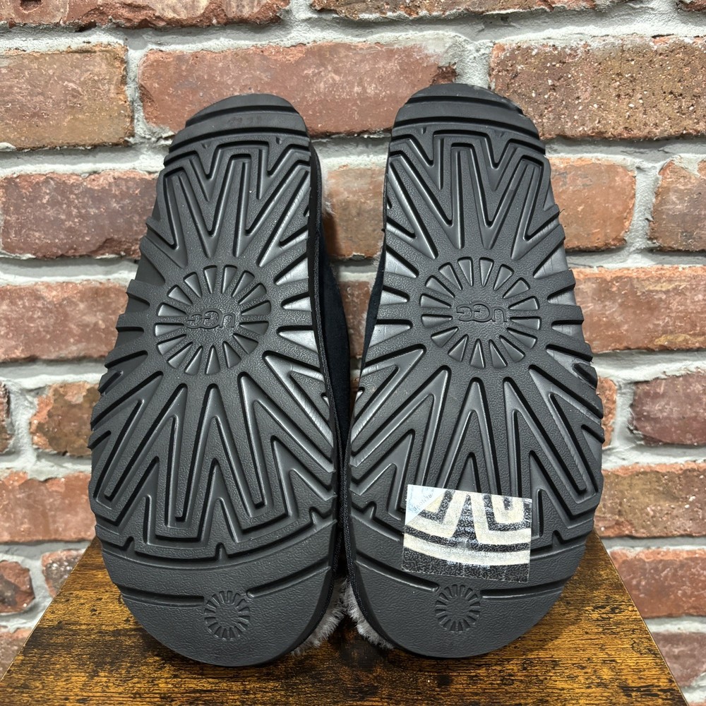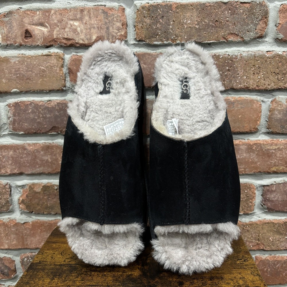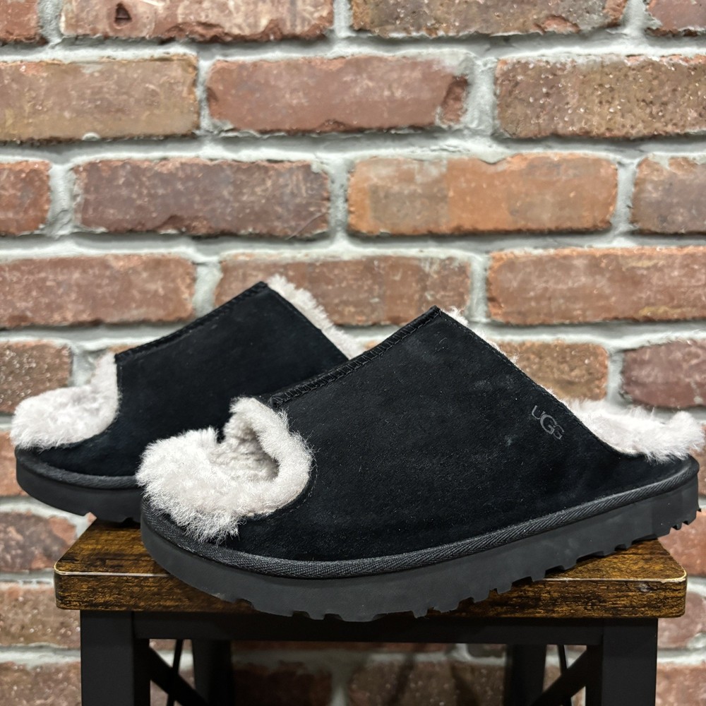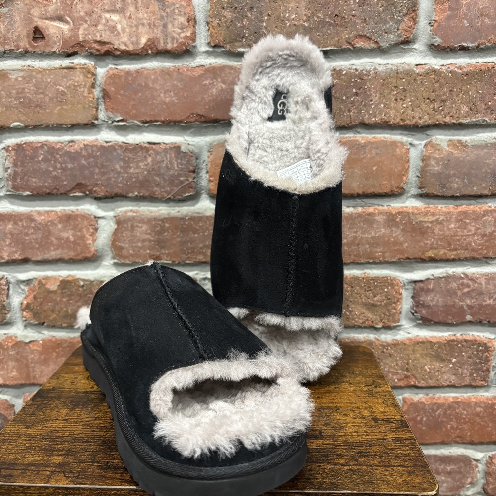 The UGG Black Classic Sheepskin Greenport Slide Slippers Shoes in women's size US 10 are a stylish and comfortable option for casual wear. These slip-on slippers feature an open toe design with a low heel height, making them perfect for all seasons. The black suede upper material with sheepskin lining and insole provides warmth and comfort, while the rubber outsole ensures durability. The fluffy UGG fur trim accents add a touch of luxury to these classic slippers, making them a must-have for any woman's shoe collection
