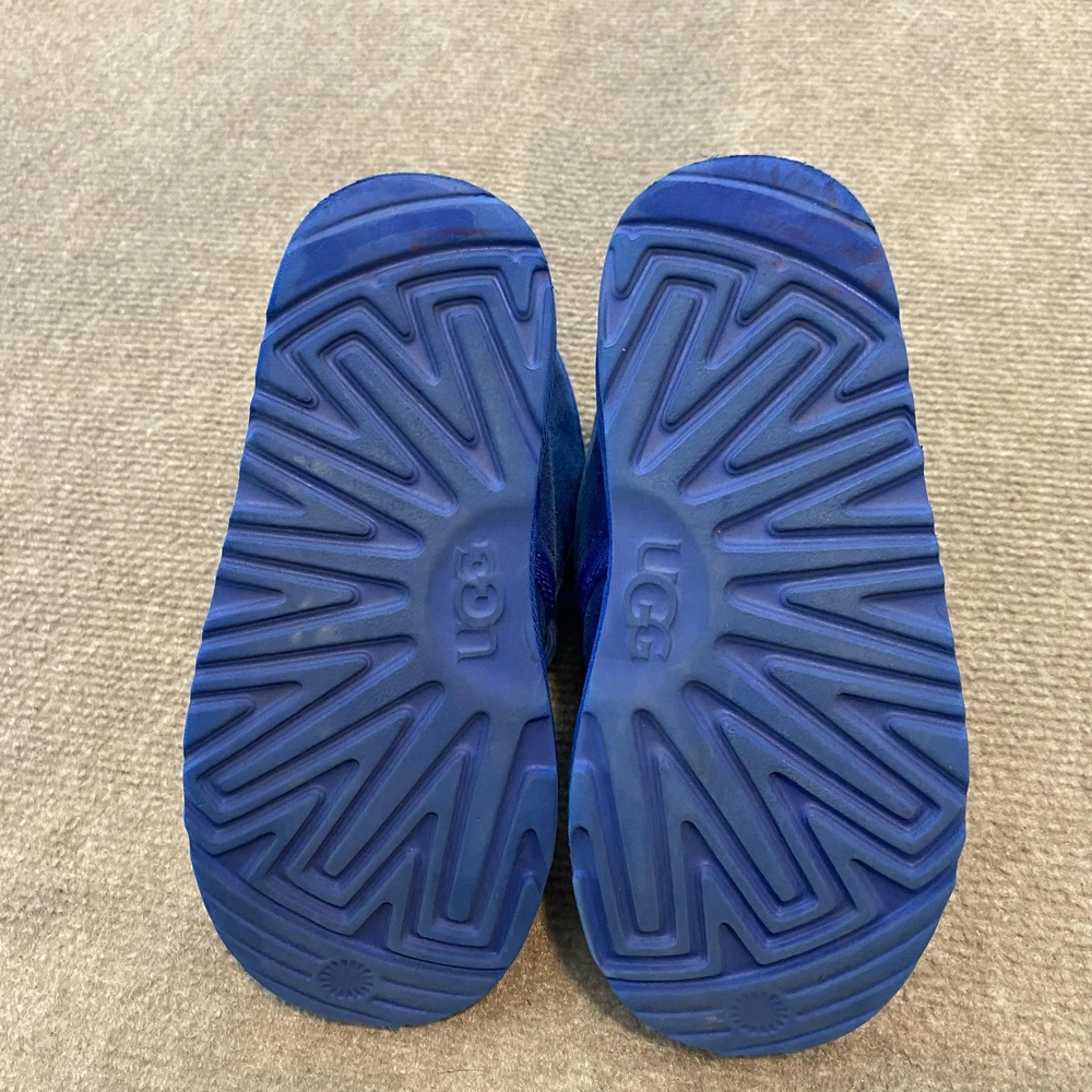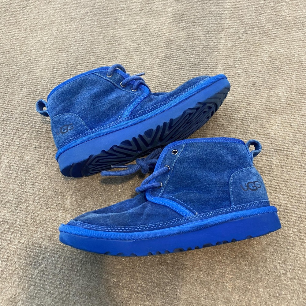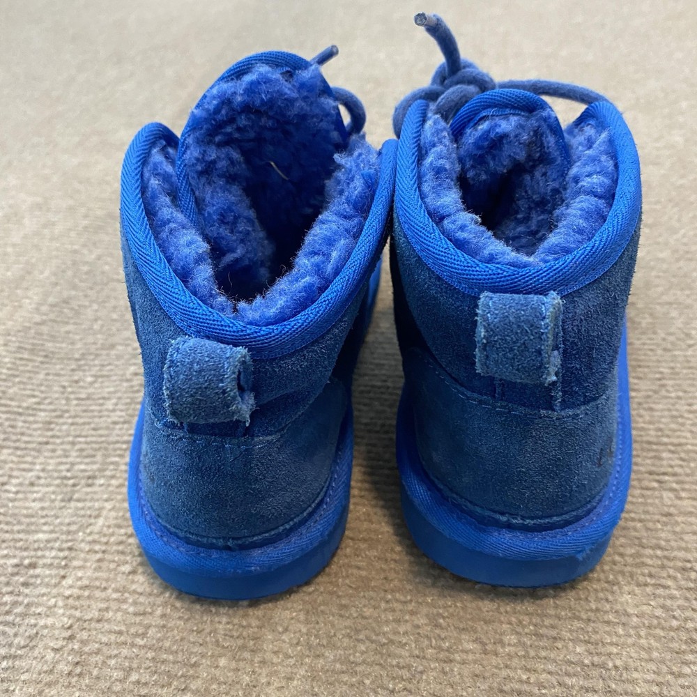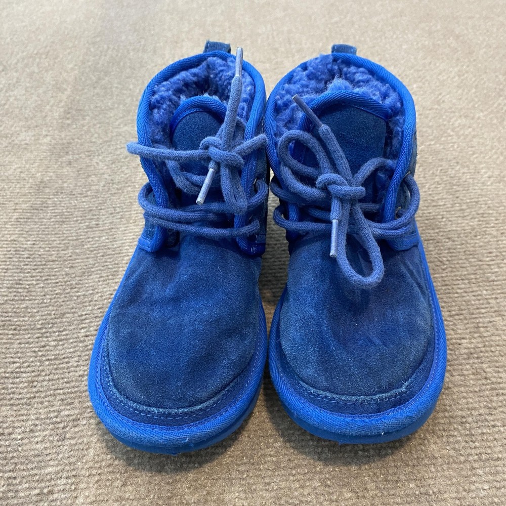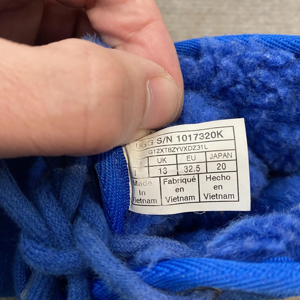 Pre-owned pair with wear to suede uppers, including creasing and some darkening on the toes and around the heels. Fleece linings show light lint and flattening but remain plush, and laces and heel pull tabs are intact with minor edge fraying. Outsoles have light surface dirt and minimal tread wear; boots are structurally solid with intact stitching and soles. No original box or additional accessories included. Brand: UGG Type: Unisex kids chukka-style winter boots with lace-up closure. Color: Solid royal blue suede uppers with matching blue midsoles, outsoles, laces, and lining. Size on tag: US 13, EU 32.5, Japan 20. Department: Unisex kids / youth. Upper material: Suede leather with stitched panel construction, round toe, padded collar, and embossed UGG logo at the heel. Lining: Soft plush fleece lining throughout interior and collar for insulation and comfort. Outsole: Blue rubber lug outsoles with UGG branding and traction pattern designed for grip during winter walking. Features: Chukka-height ankle profile, three-eyelet lace-up design, heel pull tabs, insulated and lined to keep feet warm in cold weather. Style/Model code on inner size tag: UGG S/N 1017320K; additional tag code: G12XT8ZYVKDZ31L. Country of origin: Made in Vietnam.