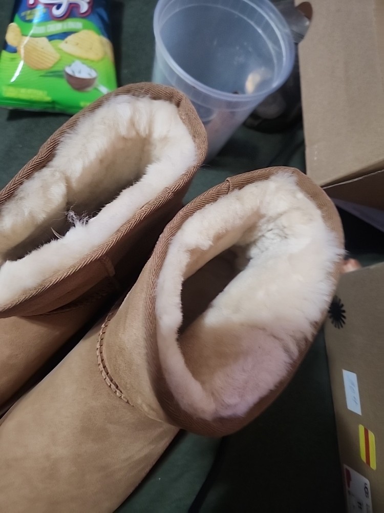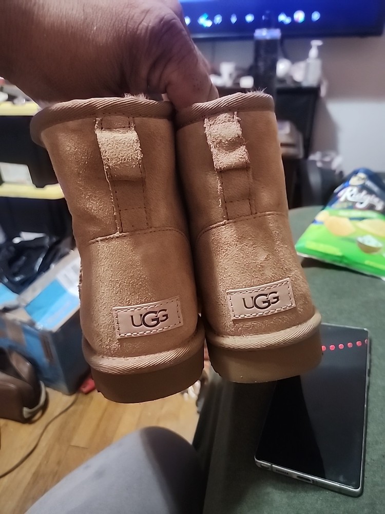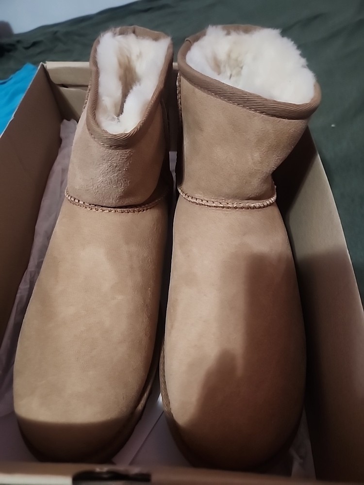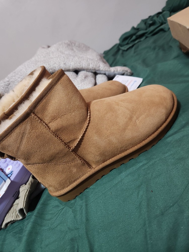 The Ugg Chestnut Classic Mini in size 7 is a women's boot featuring a chestnut-colored suede upper with the Ugg logo accent. This stylish bootie is part of the Ugg Classic product line and exudes a tropical and classic vibe with its Australian origins. The versatile design makes it a fashionable choice for various occasions, providing both comfort and style for everyday wear.