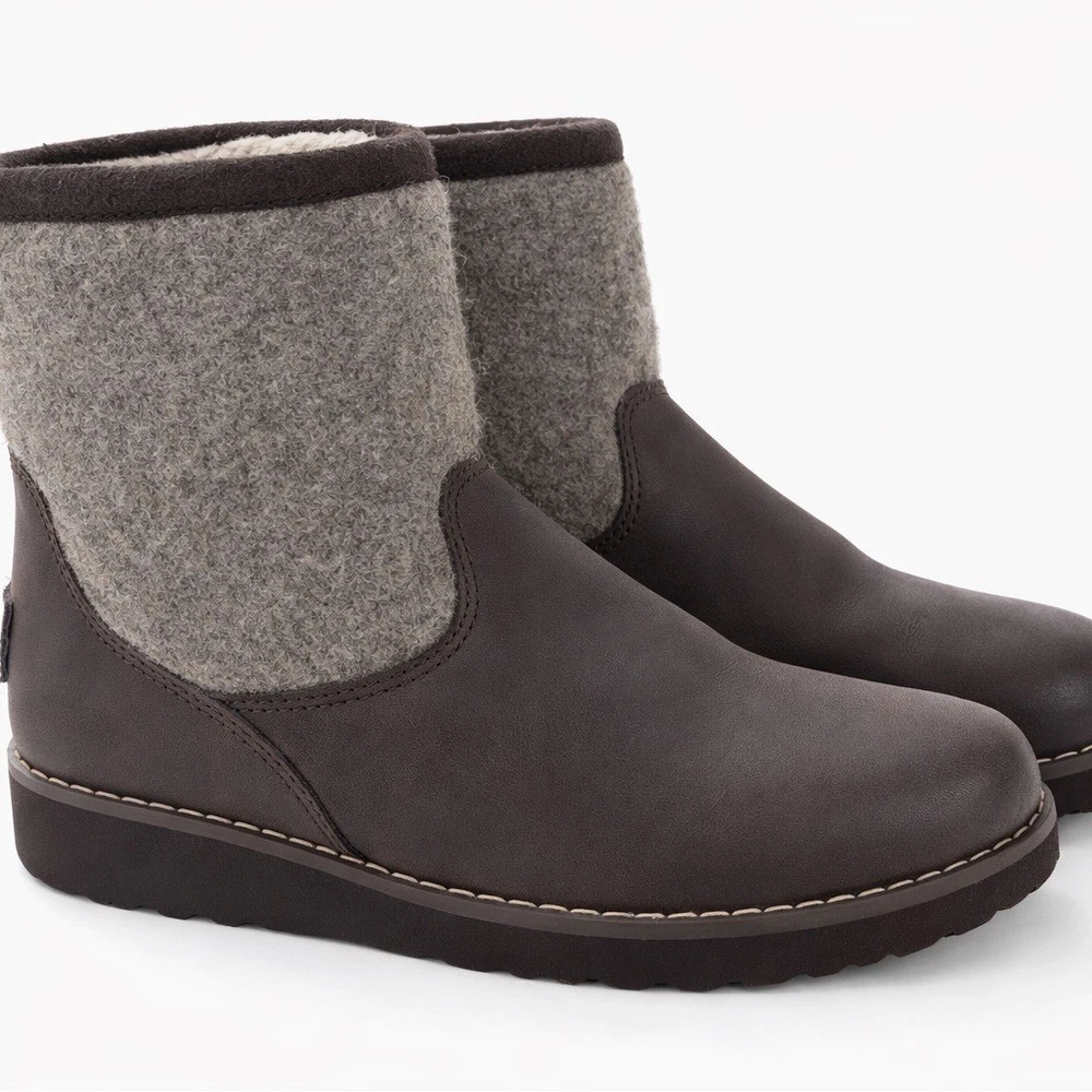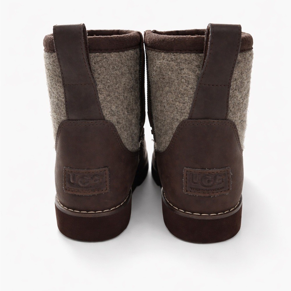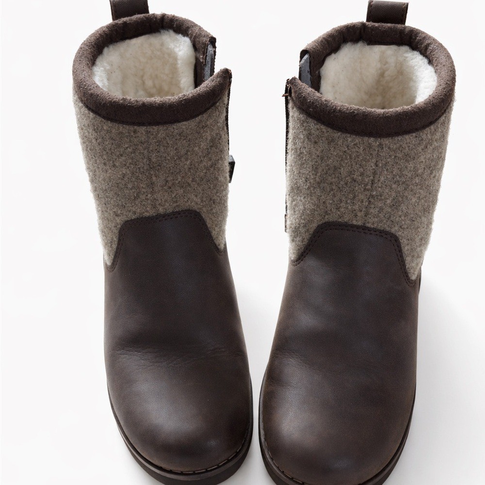Adorable UGG kids ankle boots in a brown leather and gray wool blend design with cozy shearling lining. Perfect for colder weather and easy to style with everyday outfits. Details: • Brand: UGG • Size: US 2 • Color: Brown / Gray • Material: Leather upper with wool shaft • Cozy shearling/faux shearling style lining • Pull tabs on back • Durable rubber soles Condition: Preowned with normal light wear. Please review photos closely for exact condition and details.