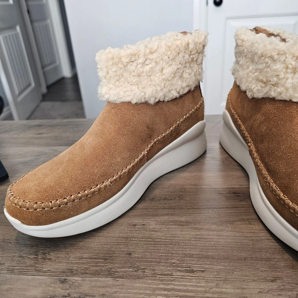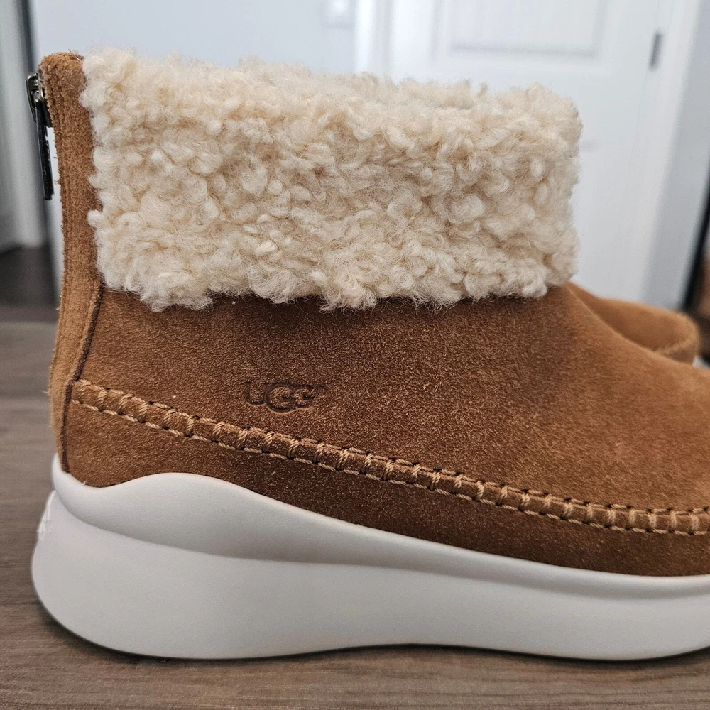 UGG Montrose Sneaker Chestnut Boots Womens Size 8.5 Brown Chunky Y2K Warm New without tags! The shoe is grounded by a Treadlite by UGG™ sole for enhanced cushioning, traction and durability. -Toe: Round toe -Closure: Zipper -Length: ankle -Color/design: Brown and White 1 1/2" heel; 3/4" platform 6" shaft Leather and UGGpure wool textile upper and lining/synthetic sole -Warm, cozy, soft, winter, casual, neutral Measurements in photos. Same day / next day shipping Offers accepted Like for price drops and deals Bundle 2 items or more and save! Thank you! 1lb 6oz