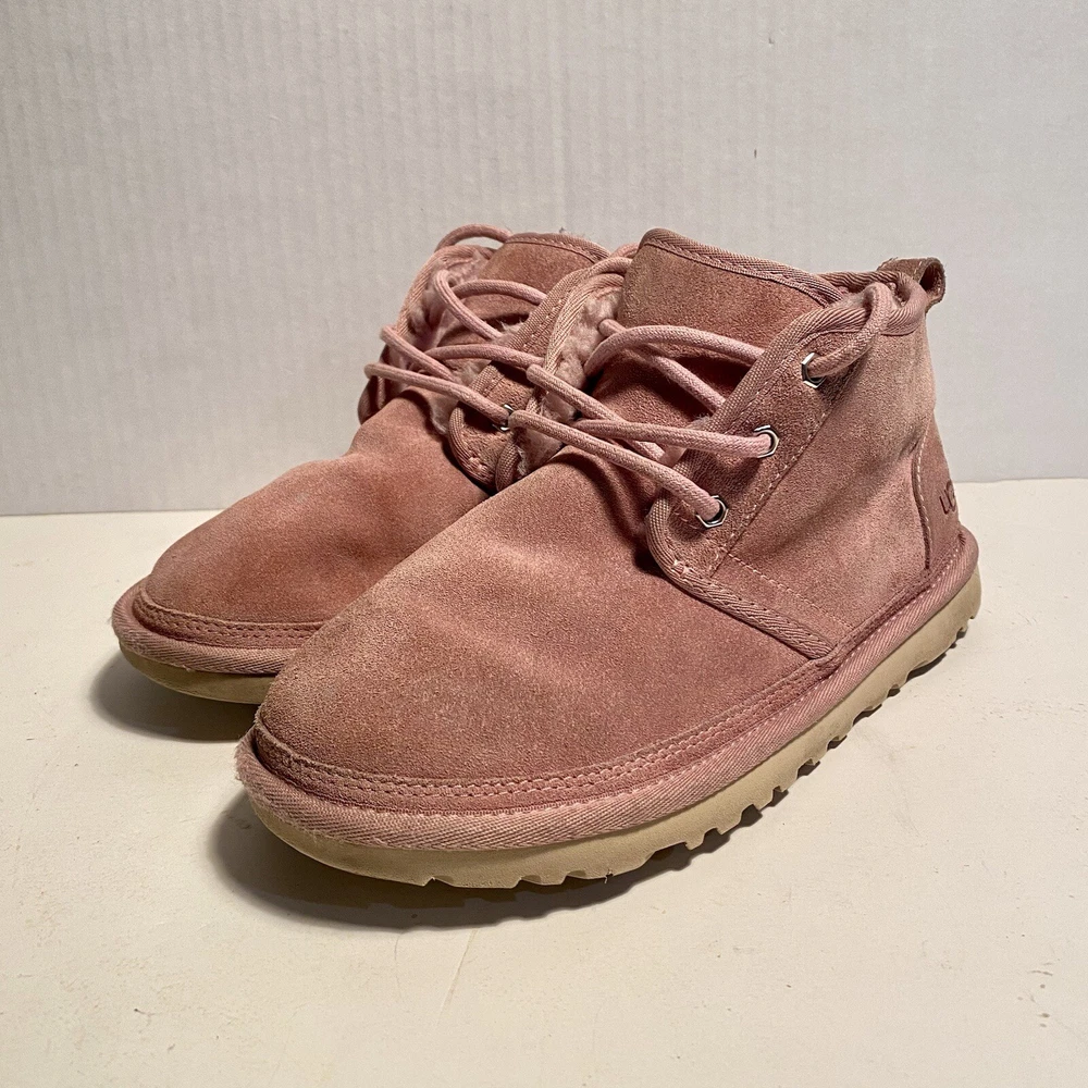 UGG NEUMEL WOMEN ANKLE BOOTS SUEDE PINK CLOUD US 7 /UK 5 /EU 38 /JP 24 Preowned in has some signs of wear bottoms in good condition overall condition 7/10 Elevate your style with these stunning UGG Neumel ankle boots. The pink cloud suede material adds a pop of color to any outfit, while the low heel height ensures comfort all day long. These boots feature a round toe shape and medium width, making them the perfect addition to any women's shoe collection. Fast responses if any questions and returns accepted if any issues with products
