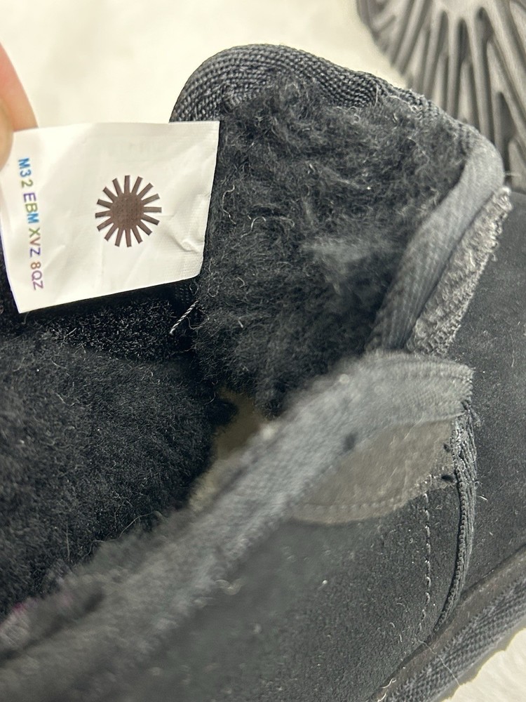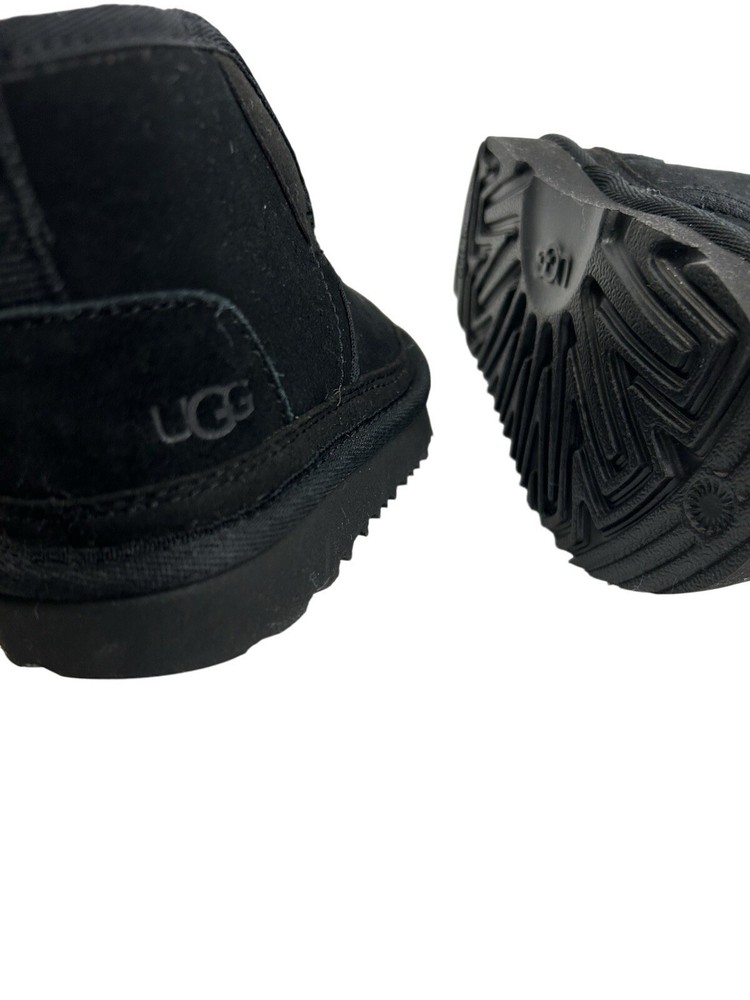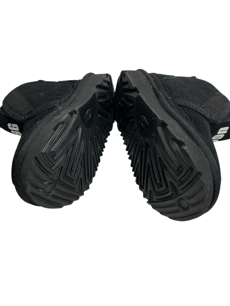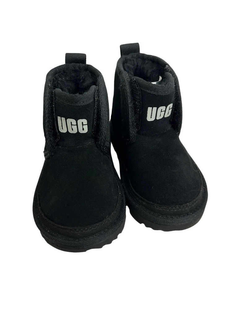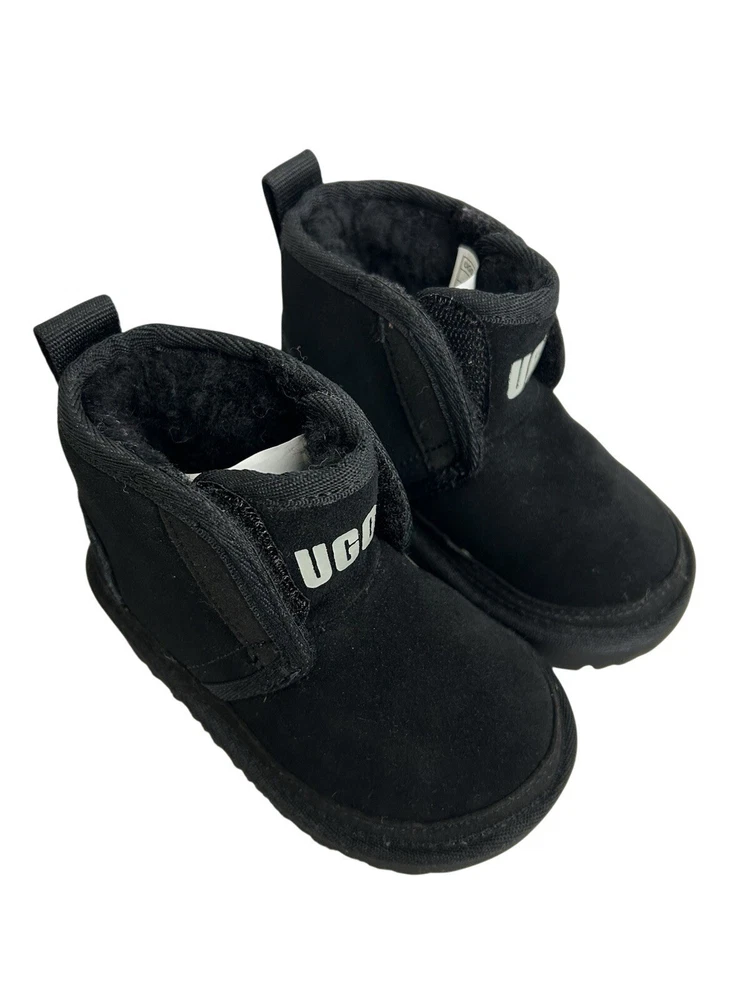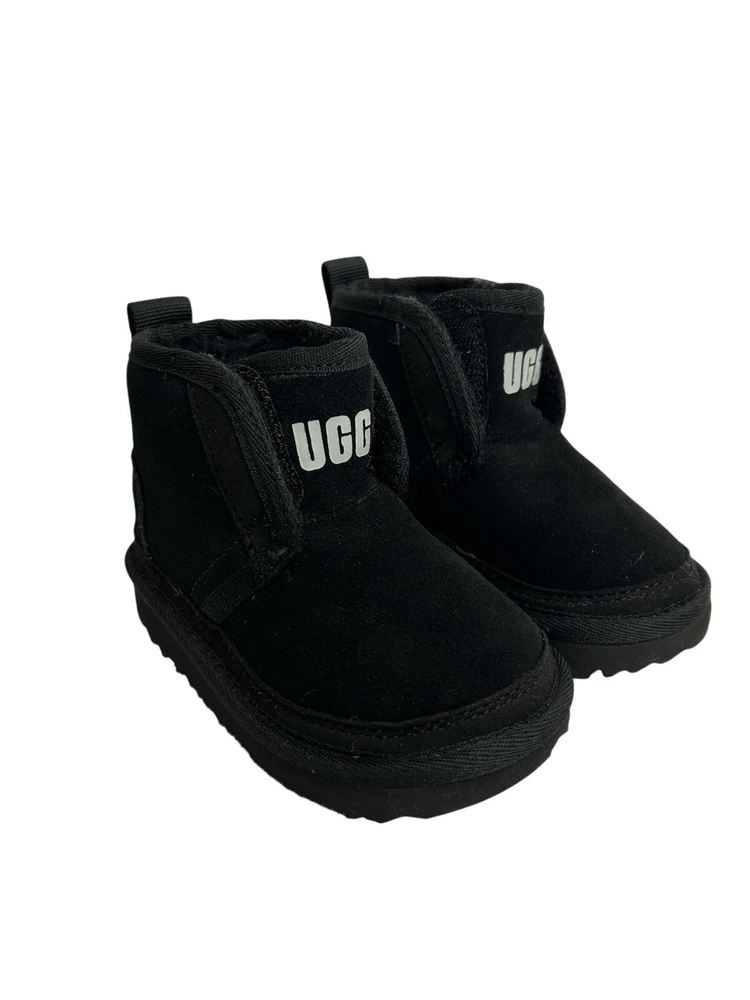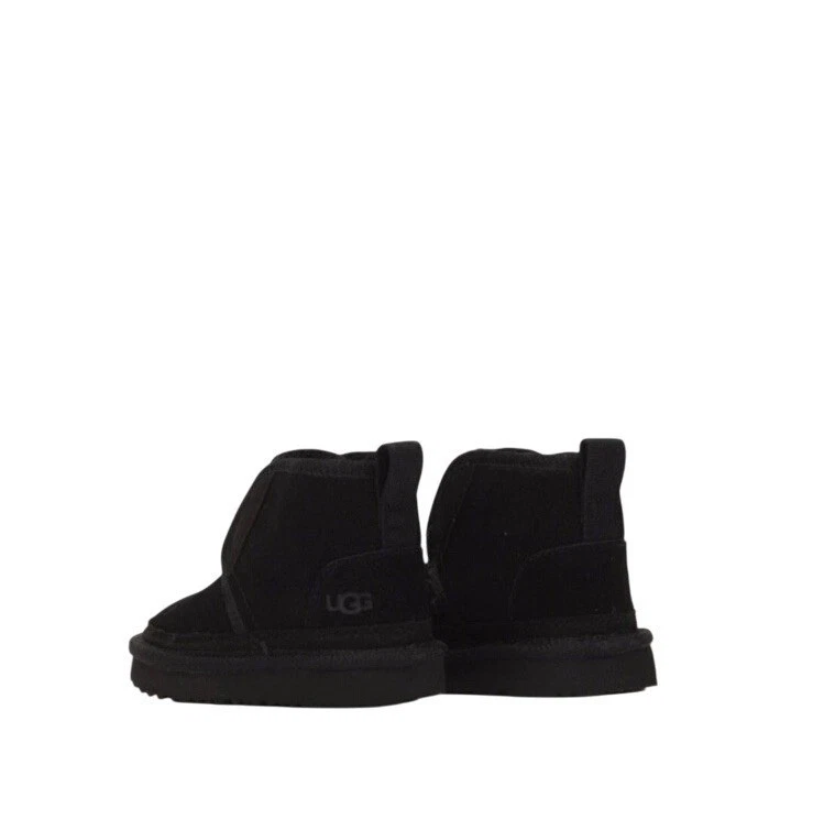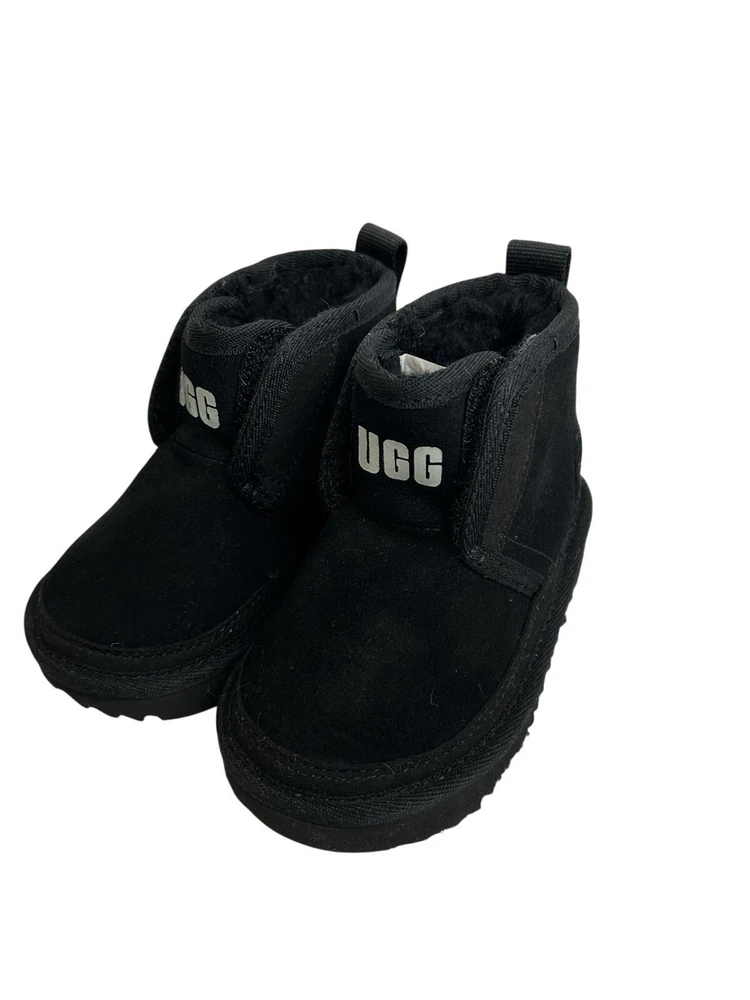 The UGG Neumel Ez-Fit Boots in toddler baby's size 6 are stylish and comfortable unisex kids' shoes. These black boots feature a Chukka style with a treadlite sole for added traction. The Australian-themed UGG Neumel collection combines fashion and practicality, making them a great choice for any young trendsetter.