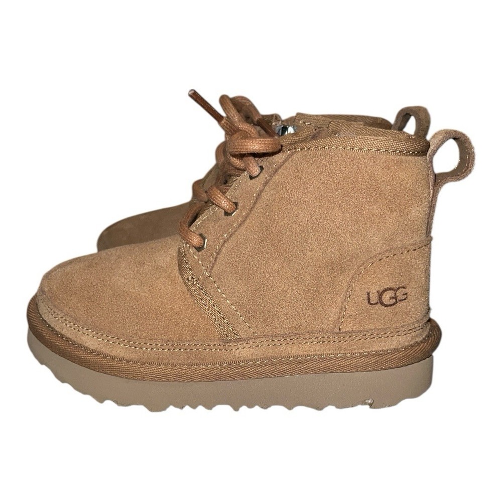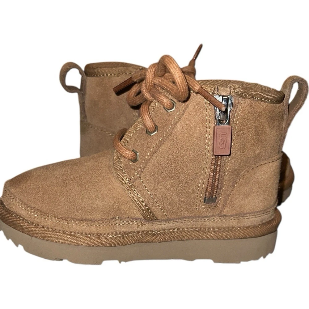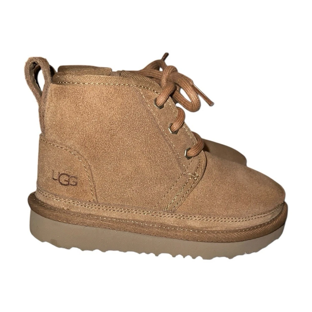 Heel Height: Flat (Under 1 in) Country of Origin: Vietnam Cleat Type: Rubber Brand: UGG Shoe Width: Standard US Shoe Size: 9 Color: Brown Vintage: No Type: Boot Product Line: Ugg Neumel Theme: Classic, Outdoor, Logo Handmade: No Accents: Logo, Zipper Performance/Activity: Walking Model: Neumel II Department: Unisex Kids Occasion: Casual Upper Material: Suede EU Shoe Size: 26 Heel Style: Flat Pattern: Solid Toe Shape: Round Toe Cushioning Level: Moderate Style: Chukka Shoe Shaft Style: Ankle Season: Winter, Fall Fabric Type: Lace Closure: Zip Features: Comfort, Lined, Insulated UK Shoe Size: 8 MPN: 1017320T Character: Boots