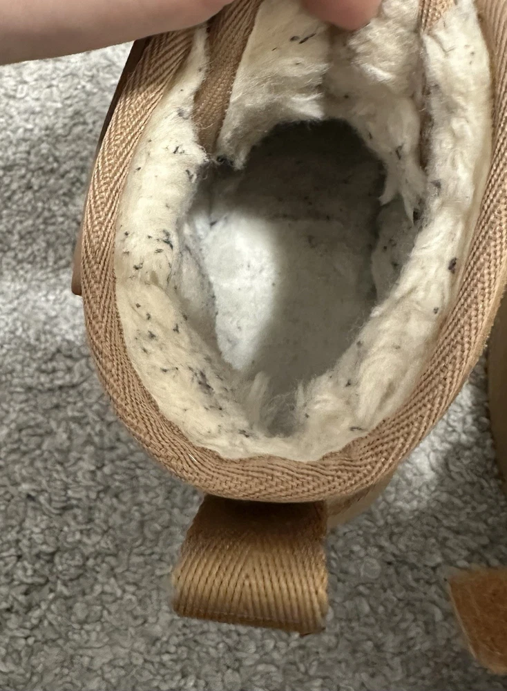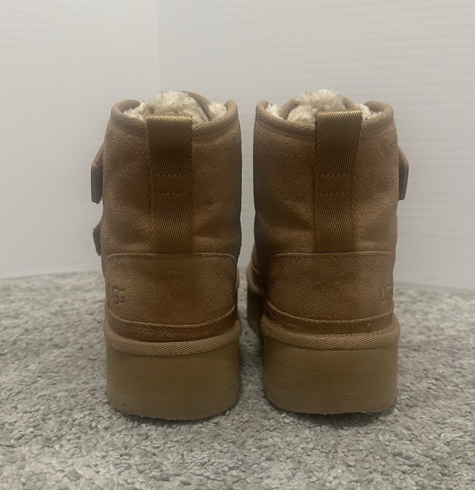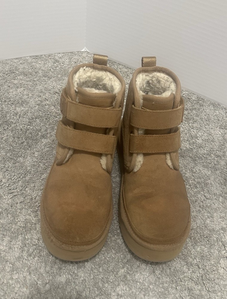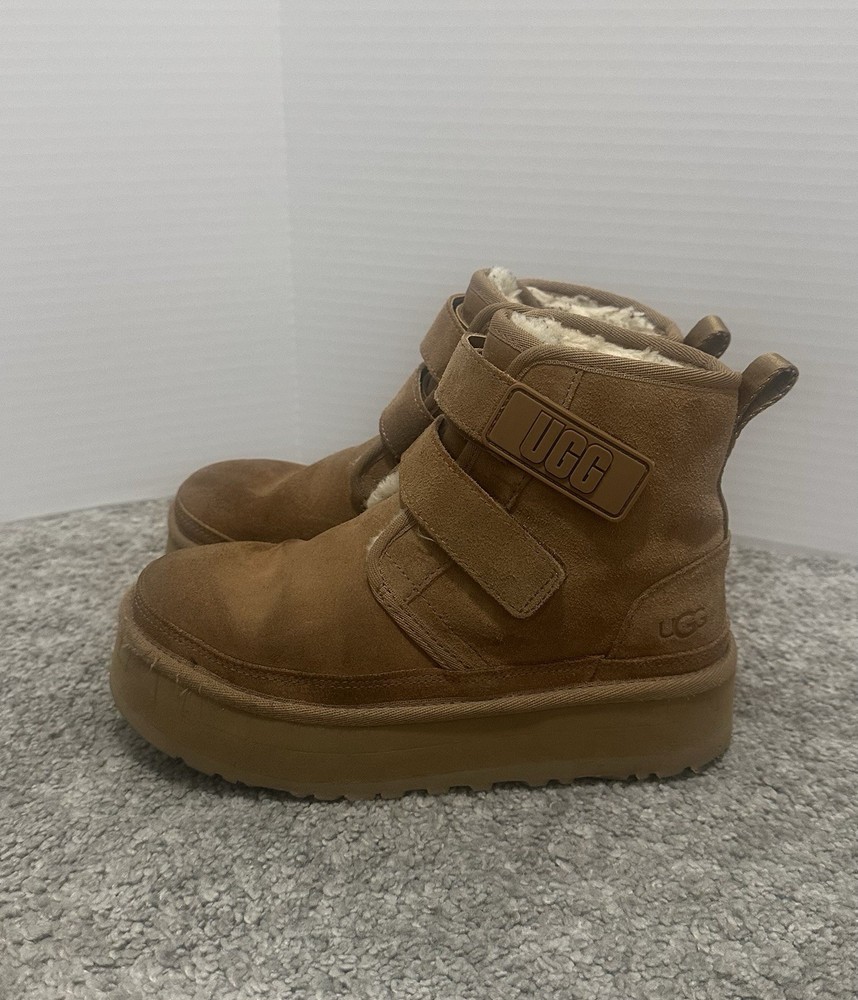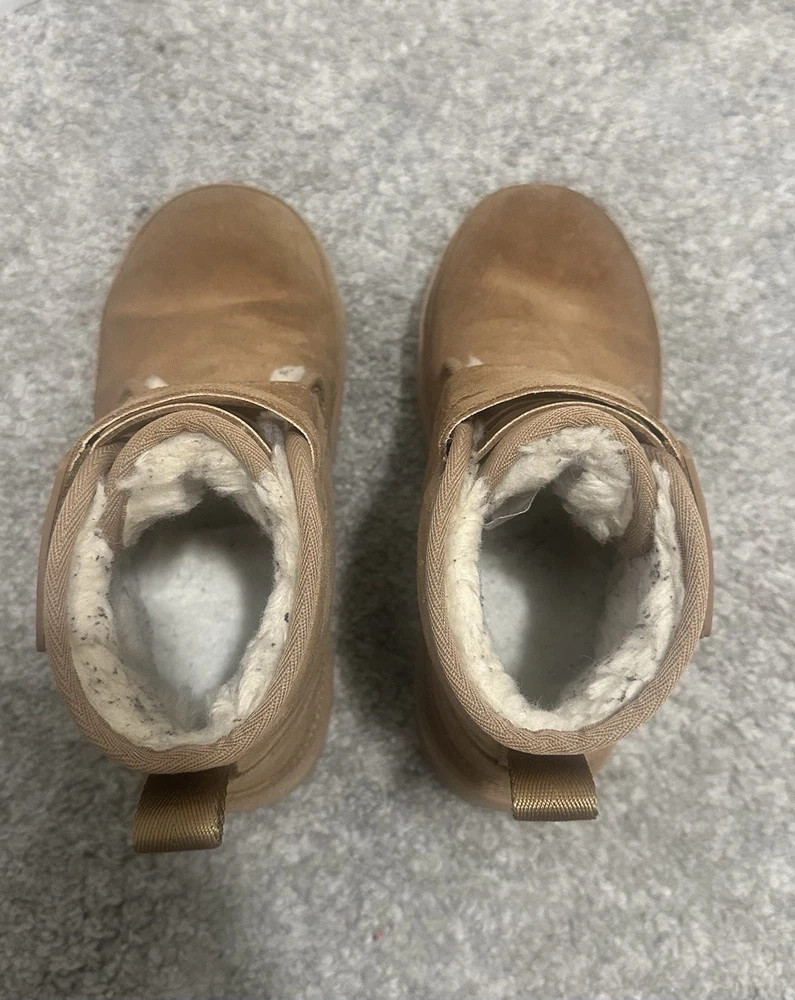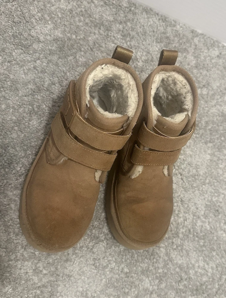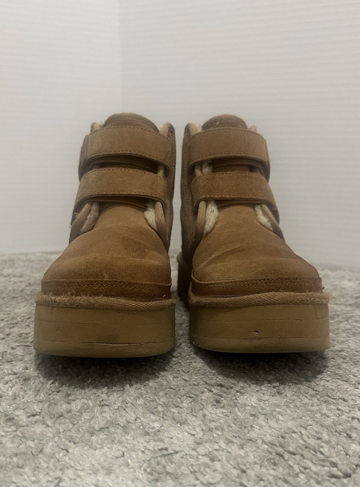 UGG Girls Brown Neumel Platform, adjustable ankle straps. Pre-owned, gently used. There are some minor abrasions on the front of the boots. There are some marks from clothing on the fur inside the boots, but these can be removed/cleaned.