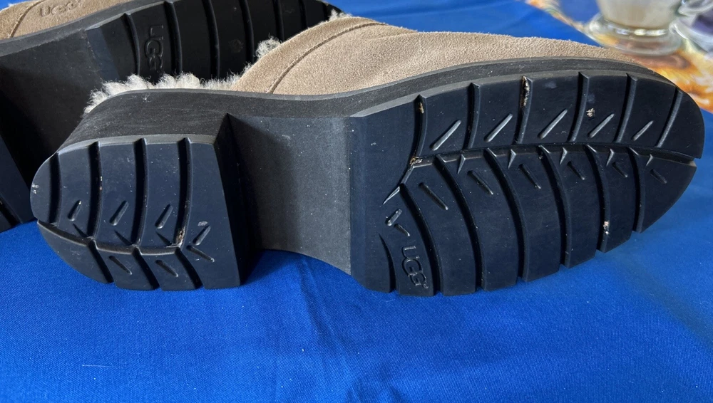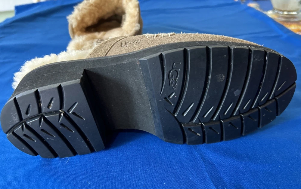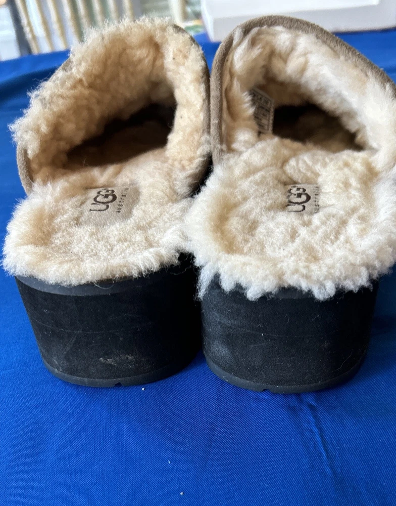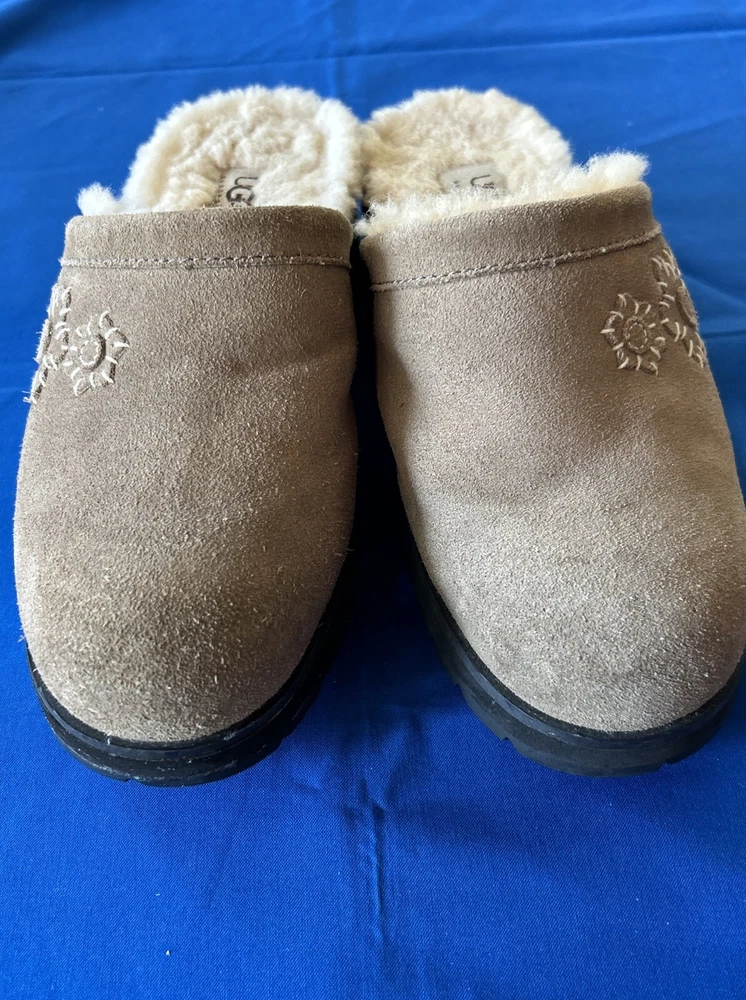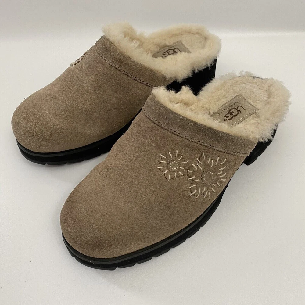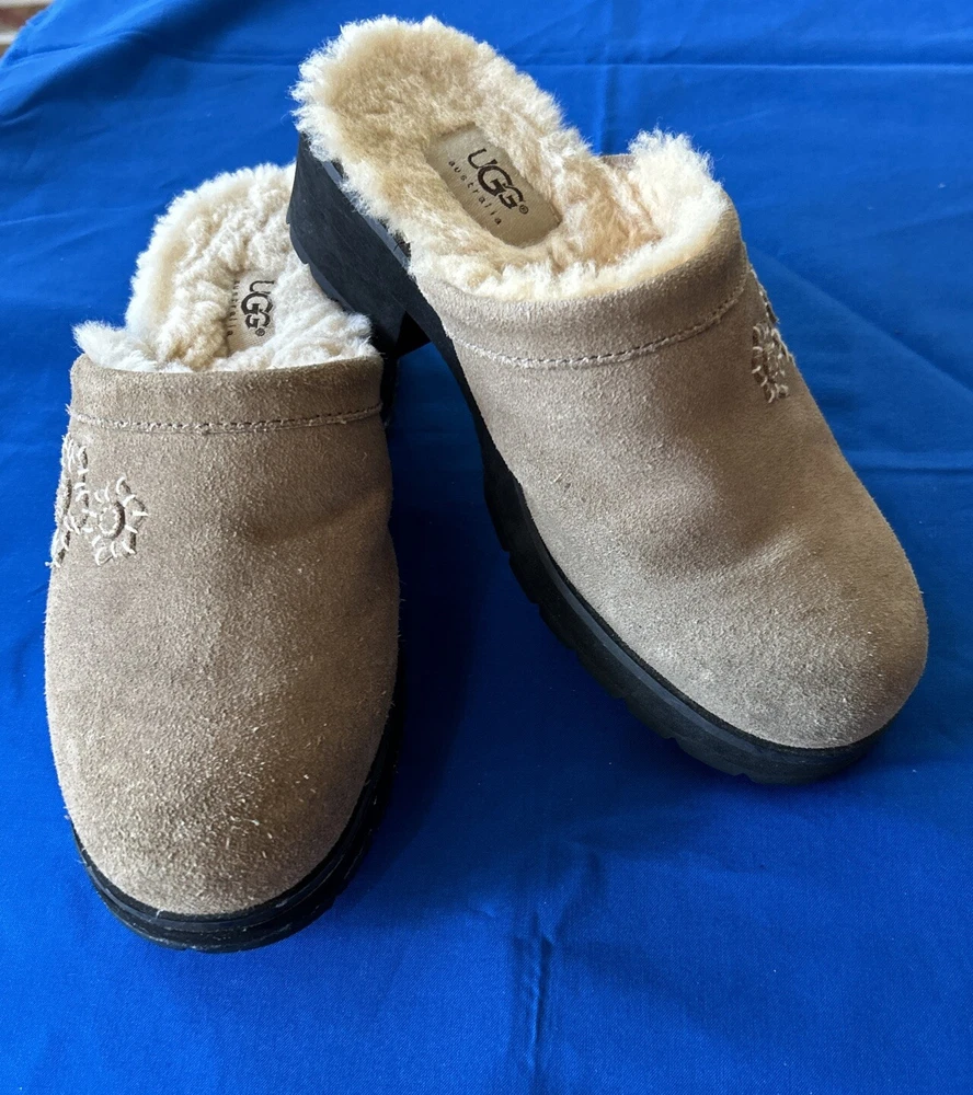 Treat your feet to ultimate comfort with these UGG Solvang slip-on clogs. Perfect for winter and fall, these shoes feature a beige suede upper with embroidered logo accents, a mid-height heel, and a slip-on closure for easy wear. The sheepskin lining and fur lining provide extra warmth and coziness, while the synthetic outsole ensures durability and traction. These UGG slip-on clogs are a must-have addition to your shoe collection. They come in a standard shoe width, and are available in UK size 6, US size 7, and EU size 38. Whether you're running errands or going out with friends, these shoes will keep your feet feeling warm and stylish. Color in first pic is true color