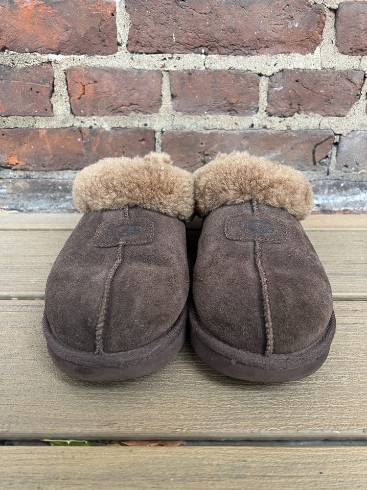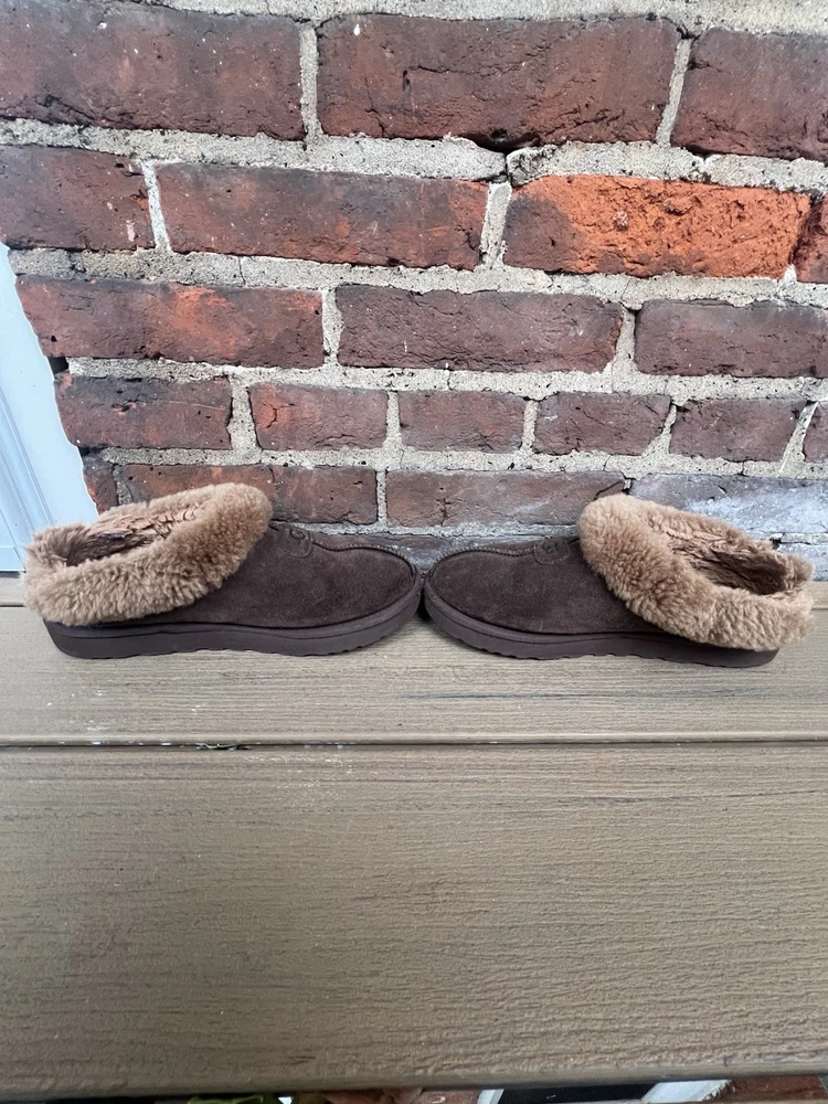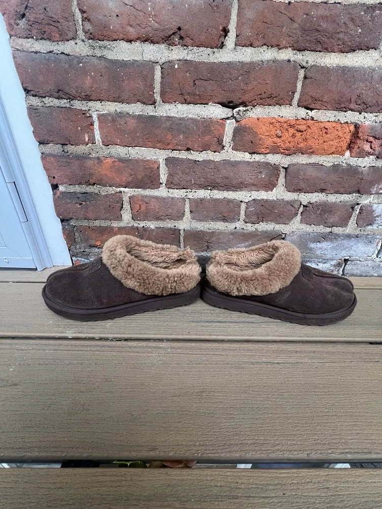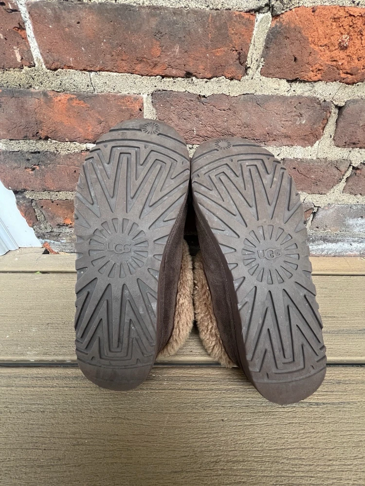 The UGG Tazzette Burnt Cedar Slippers 1134810 are women's winter shoes in a US size 10. These slip-on slippers feature a solid brown color with a closed toe and shearling lining for ultimate comfort and warmth. The low heel height, cushioned insole, and wool insole material make them perfect for casual occasions during the winter season. The shearling fabric type and fur trim accents add a touch of luxury to these UGG slipper shoes, which are designed for ultimate comfort and style. Made with suede upper material and a polyurethane outsole, these UGG Tazzette slippers are a stylish and cozy choice for the colder months.