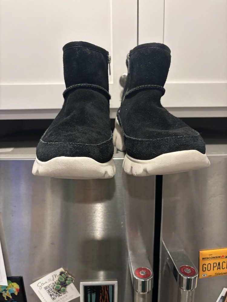 Step into comfort and style with these UGG women's boots. The black suede material and white soles create a chic and timeless look that will complement any outfit. The boots feature a zipper closure for easy wear and a Dry Tech lining to keep your feet dry and comfortable. These shoe boots are perfect for any occasion, whether you're running errands or going out for a night on the town. The UGG brand is known for its quality and comfort, and these boots are no exception. Don't miss out on the opportunity to add these stylish boots to your shoe collection.