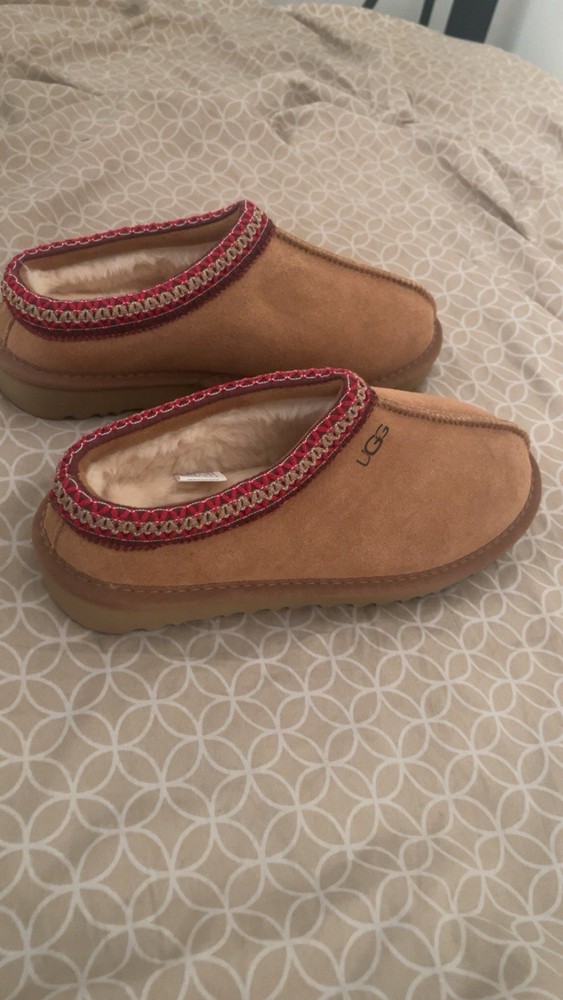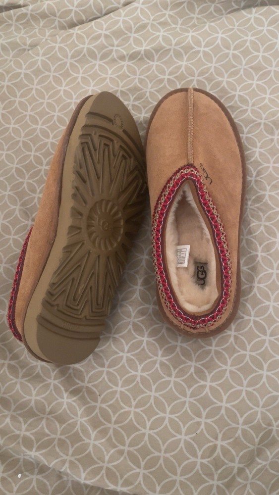 UGG Women's Slip-On Suede Shearling Slippers Brown with Red Patterned Trim