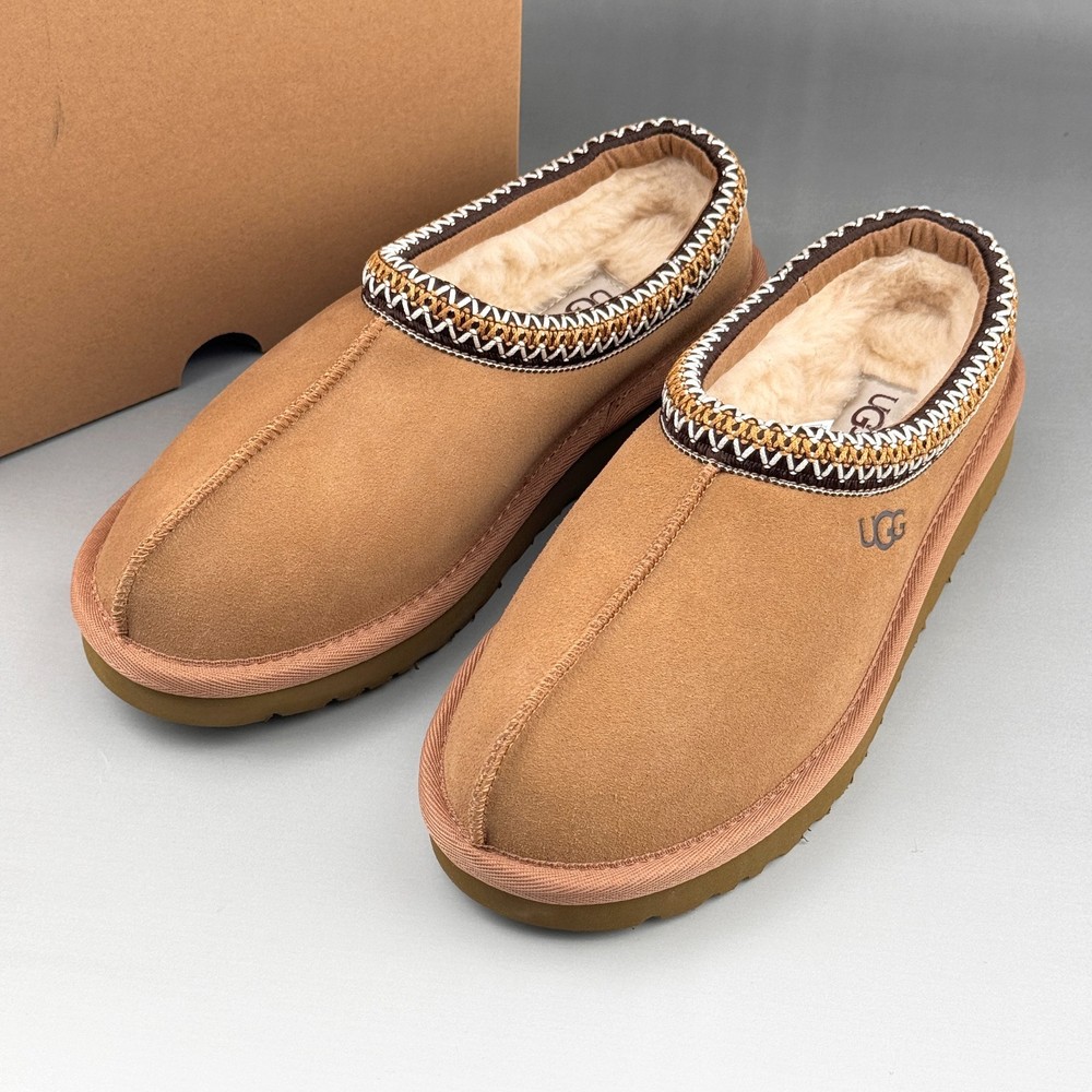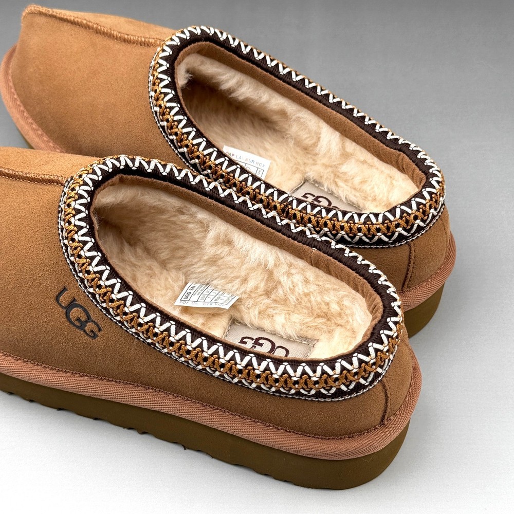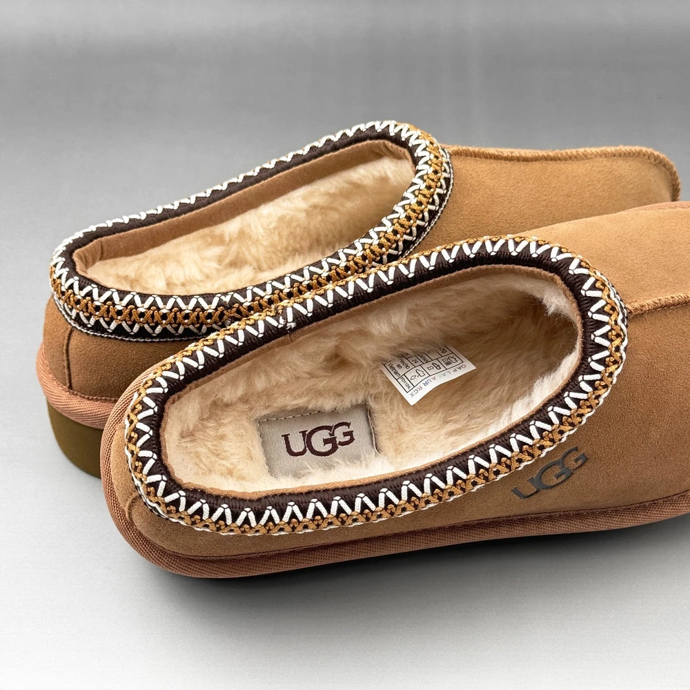 Women's Shoes US 6 - EU 37 - 230MM -(Heel-Toe 9.06IN) US 7 - EU 38 - 240MM -(Heel-Toe 9.45IN) US 8 - EU 39 - 250MM -(Heel-Toe 9.84IN) US 9 - EU 40 - 260MM -(Heel-Toe 10.24IN) US 10 - EU 41 - 270MM -(Heel-Toe 10.63IN) US 11 - EU 42 - 280MM -(Heel-Toe 11.02IN) Embrace cozy elegance with the Tasman Slip-On Slipper, a blend of style and warmth crafted for comfort. Made with a leather exterior, these slippers offer a classic look that’s effortlessly stylish. Inside, the soft 17mm lining and plush wool insole cushion your feet, adding warmth and support to every step. The rubber outsole provides excellent grip and a lightweight feel, ideal for both indoor lounging and light outdoor strolls. With a suede upper and a charming embroidered trim, these slip-ons elevate your casual wear, making every moment feel a touch more refined. Features: Material: Made from 100% leather for durability and a classic appearance. Lining: Soft 17mm lining for warmth and comfort. Insole: Features a 17mm wool insole for cushioning. Outsole: The rubber outsole provides excellent traction and lightweight comfort. Style: Suede upper with decorative embroidered trim, for lounging or light outdoor wear. Recycled Components: Textile binding made from 100% recycled polyester fibers reinforces our commitment to sustainability. Quality Branding: Features a heat-embossed UGG® logo and a woven label on the insole for authenticity. Genuine Fur : Contains real fur from sheep or lamb, sourced ethically from Australia, Ireland, the UK, or the US, and treated for durability.