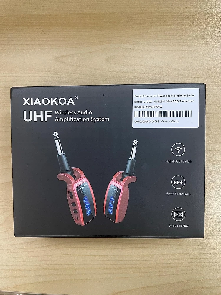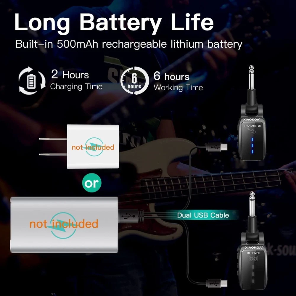 Wireless Guitar System: The wireless guitar transmitter receiver utilizes Latest UHF technology that delivers great audio quality and stable signal.The max transmission range is 164ft/50m(in an open area) Digital Display: As a great guitar accessories,the guitar wireless system with LED screen which can clearly display frequency, volume and power.Very easy to use,plug and play. Widespread Use: 280°rotatable plug design, available for most electric music instruments, electric guitar, bass and other musical instruments with pickup. Durable battery: Built-in 500mAh rechargeable lithium battery, working time is up to 6 hours after fully charged. 15 Channnels: This wireless audio transmission system with 15 channels,supports 15 sets of devices working at same time, one-to-one and no-interference; and one transmitter can transmit signal to several receivers at the same time also. Product Description The video showcases the product in use. The video guides you through product setup. The video compares multiple products. The video shows the product being unpacked. LED Display You can intuitively learn and master the frequency , volum e and power and adjust them easily. Built-in 500 mAh rechargeable battery, if full charged, the system can work for about 6 hours. 280° Rotatable Plug Design Available for instruments with input jack in different positions. Wireless transmitters and receivers can be used for electro acoustic instruments such as guitars, bass, violins, etc. Material ABS Frequency Range 570.5MHz-598.5MHz Frequency Response 60Hz-17KHz Transmission Method UHF Wireless Pairing Method Automatic pairing Power Consumption <75mA Charging Voltage DC 5V Battery Type 500mAh polymer battery Why is there no sound? The transmitter and receiver are not connected properly. The blue indicator light of the receiver stops flashing and the connection is normal. Why is there noise? The distance between the receiver and transmitter is too close to cause electronic interference. Keep the distance between the receiver and transmitter at least two meters.