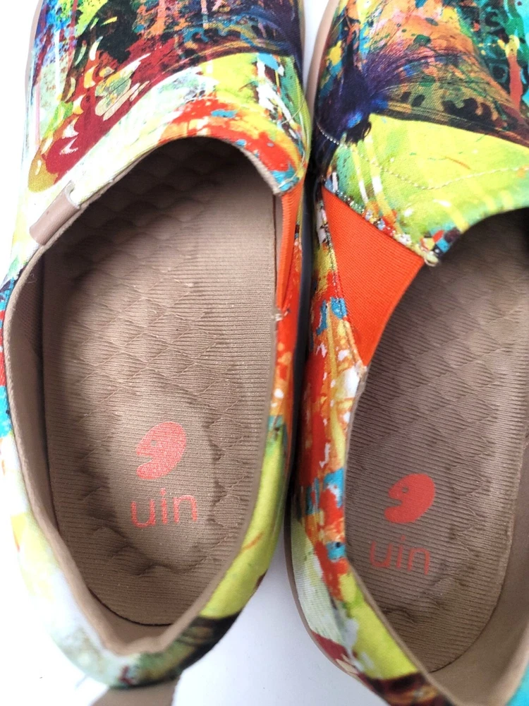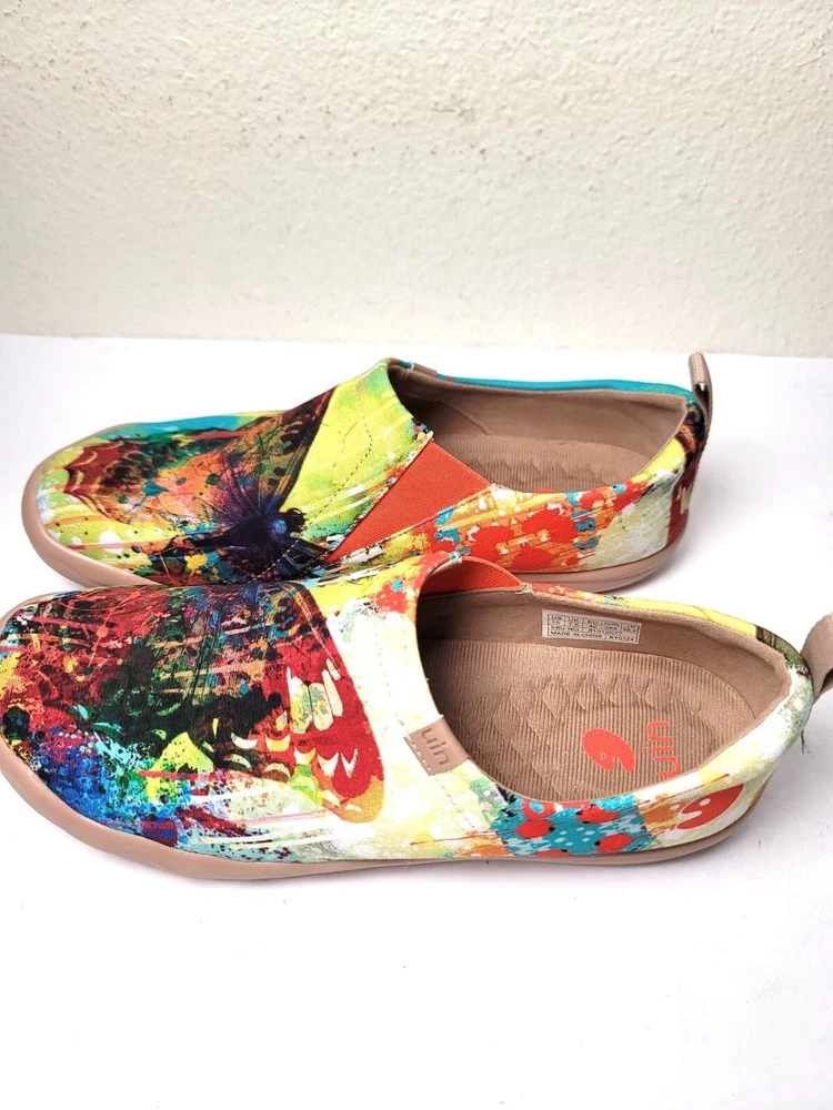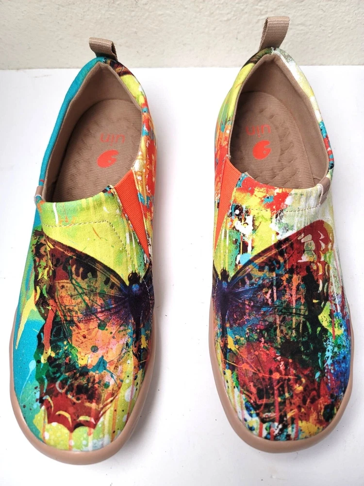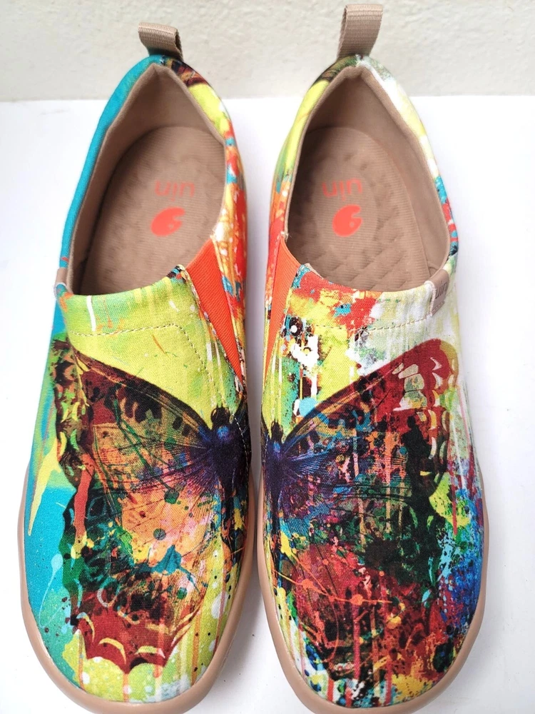 These slip-on shoes by Uin combine art and comfort, showcasing an eye-catching butterfly design in a vibrant palette. The soft canvas material ensures breathability, while the cushioned sole provides support for everyday wear. Perfect for adding a pop of color to your wardrobe while keeping your feet relaxed. • Slip-on design for easy wear • Vibrant multicolor butterfly print • Cushioned insole for comfort • Durable rubber sole • Pull tab for easy on/off CONDITION pre owned, gently use, good conditions. see photos for more details.