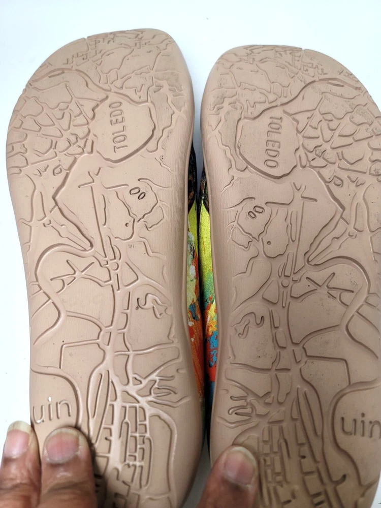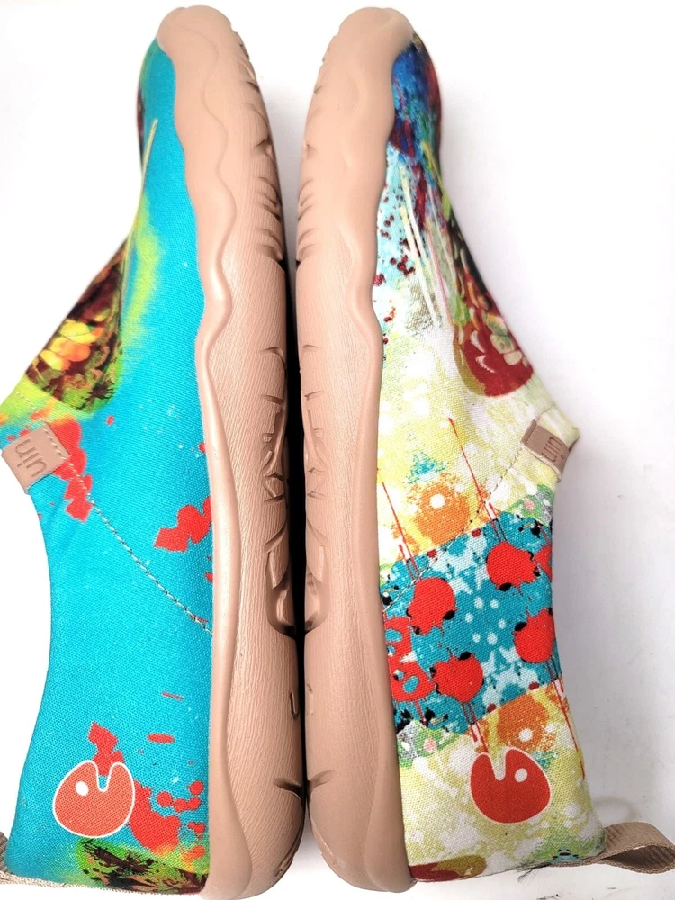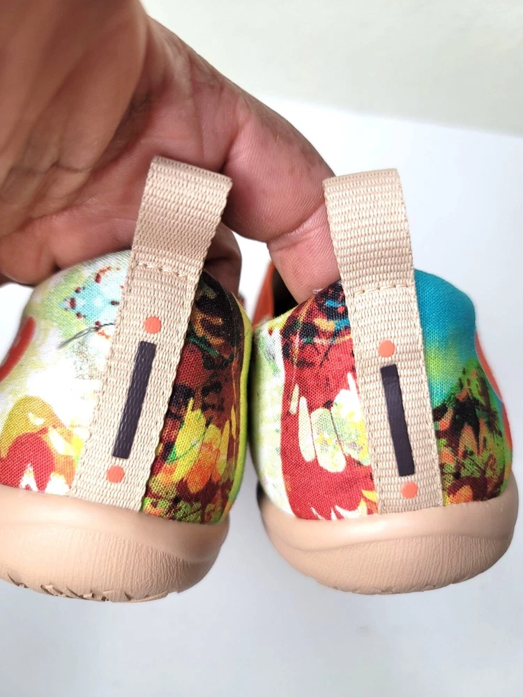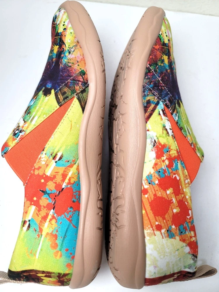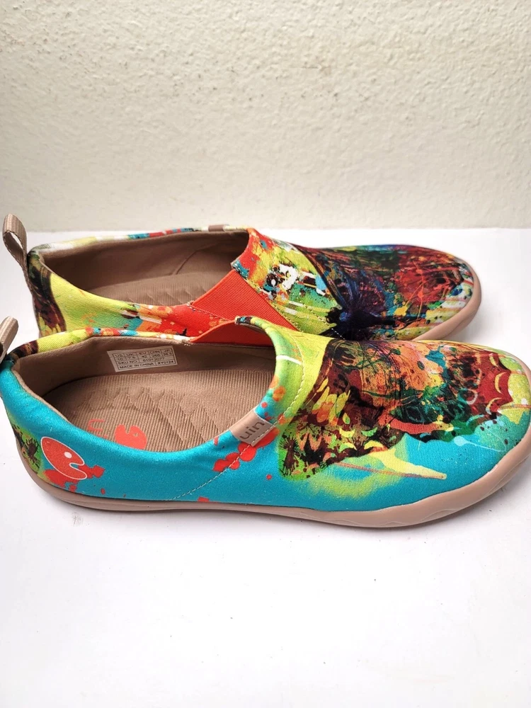 These slip-on shoes by Uin combine art and comfort, showcasing an eye-catching butterfly design in a vibrant palette. The soft canvas material ensures breathability, while the cushioned sole provides support for everyday wear. Perfect for adding a pop of color to your wardrobe while keeping your feet relaxed. • Slip-on design for easy wear • Vibrant multicolor butterfly print • Cushioned insole for comfort • Durable rubber sole • Pull tab for easy on/off CONDITION pre owned, gently use, good conditions. see photos for more details.