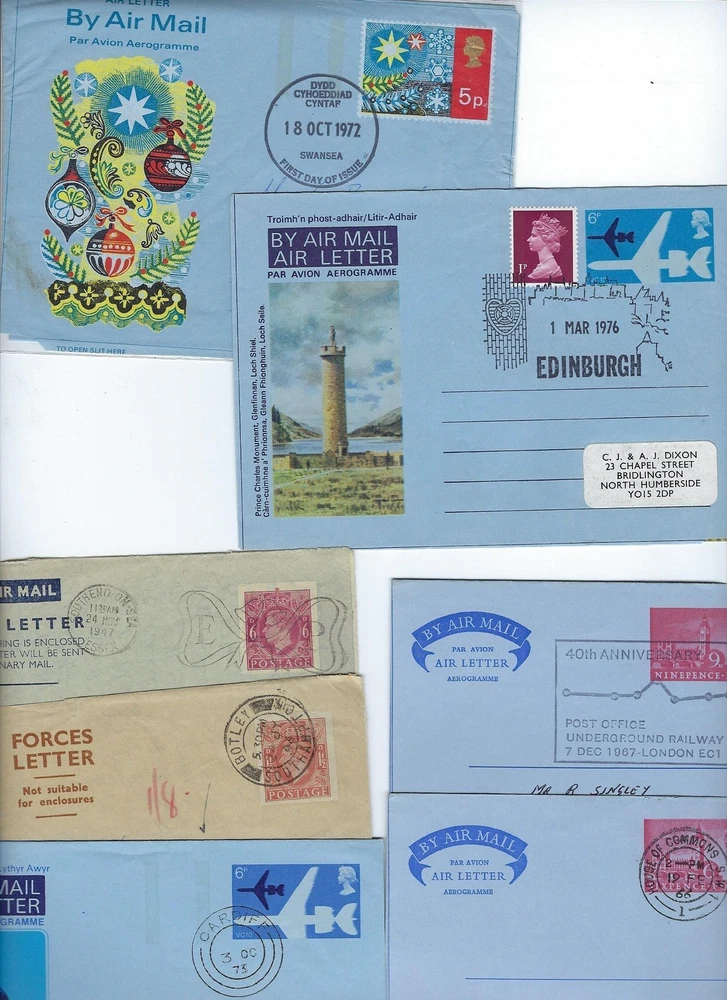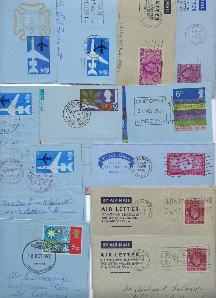 U.K. G.B. 1940-1980's LARGE COLLECTION OF 19 AIR LETTERS INCLUDING FDC's SPECIAL CANCELS FORCES LETTERS SEE SCANS PLEASE VISIT MY EBAY STORE : Filatco Stamps BUY 5 ITEMS SHIPPING & REGISTRATION IS FREE INTERNATIONAL BUYERS PLEASE NOTE: EBAY AND PAYPAL REQUIRE REGISTRATION FOR TRACKING INTERNATIONAL SHIPMENTS. EBAY CHARGES $12.61 FOR SHIPPING LABELS WITH TRAKING # US POST OFFICE CHARGES $14.95 FOR REGISTRATION # + POSTAGE BUYER HAS THE CHOICE OF SHIPPING FIRST CLASS MAIL WITHOUT TRACKING # FOR $2.50 . IN THIS CASE BUYER ACCEPTS RESPONSIBILITY IF ITEM IS LOST IN TRANSIT. Feel free to ask if you have any questions. PAYMENT WITHIN 2 DAYS IS APPRECIATED . FEEDBACK : I APPRECIATE YOUR BUSINESS AND MY TOP CONCERN IS TO MAKE SURE YOU ARE 100% PLEASED WITH ANY ITEM YOU PURCHASE. IF YOU HAVE A CONCERN OR A PROBLEM WITH INVOICE, SHIPPING OR ANY ITEM YOU RECEIVED PLEASE CONTACT ME FIRST BEFORE YOU LEAVE ANY FEEDBACK. I GUARANTEE YOU WILL BE 100% SATISFIED WITH THE TRANSACTION. I WILL CERTAINLY LEAVE YOU A POSITIVE FEEDBACK AS SOON AS I RECEIVE YOURS.