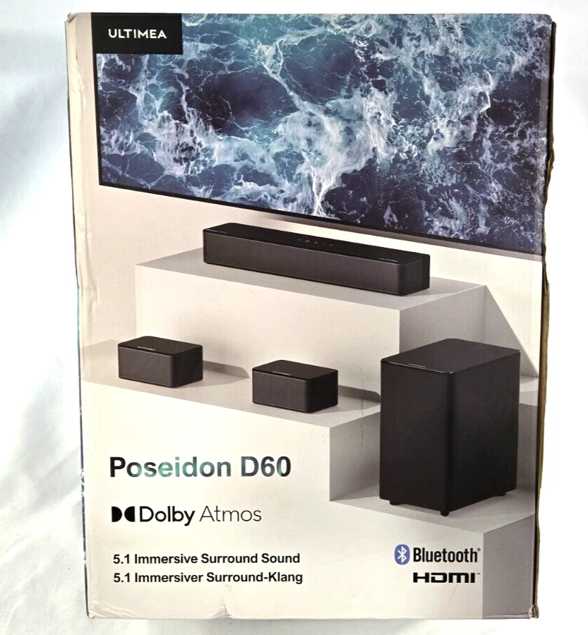 Color: Black Manufacturer: ULTIMEA UPC: 196271623342 RMS Power: 410 W System Configuration: 5.1 Channel Item Height: 2.76 in Model Number: Poseidon D60 Surround Sound Formats: Dolby Atmos Brand: ULTIMEA Item Weight: 11.7lbs Driver Size: 5.25 in gtin13: 196271623342 Target Audience Keyword: home, soundbar, subwoofer, Ultimea, Bose, theater, dolby, atmos ASIN: B0D4YMX57L Year Manufactured: 2024 Audio Inputs: 3.5 mm Jack, Digital Optical TOSLINK, HDMI Country/Region of Manufacture: China Features: All-in-One, Bluetooth, Design, High End, Remote Control Connectivity: Bluetooth, Wireless Type: Home Theater Speaker System Item Length: 15.75 in Model: Poseidon D60 Item Width: 3.54 in