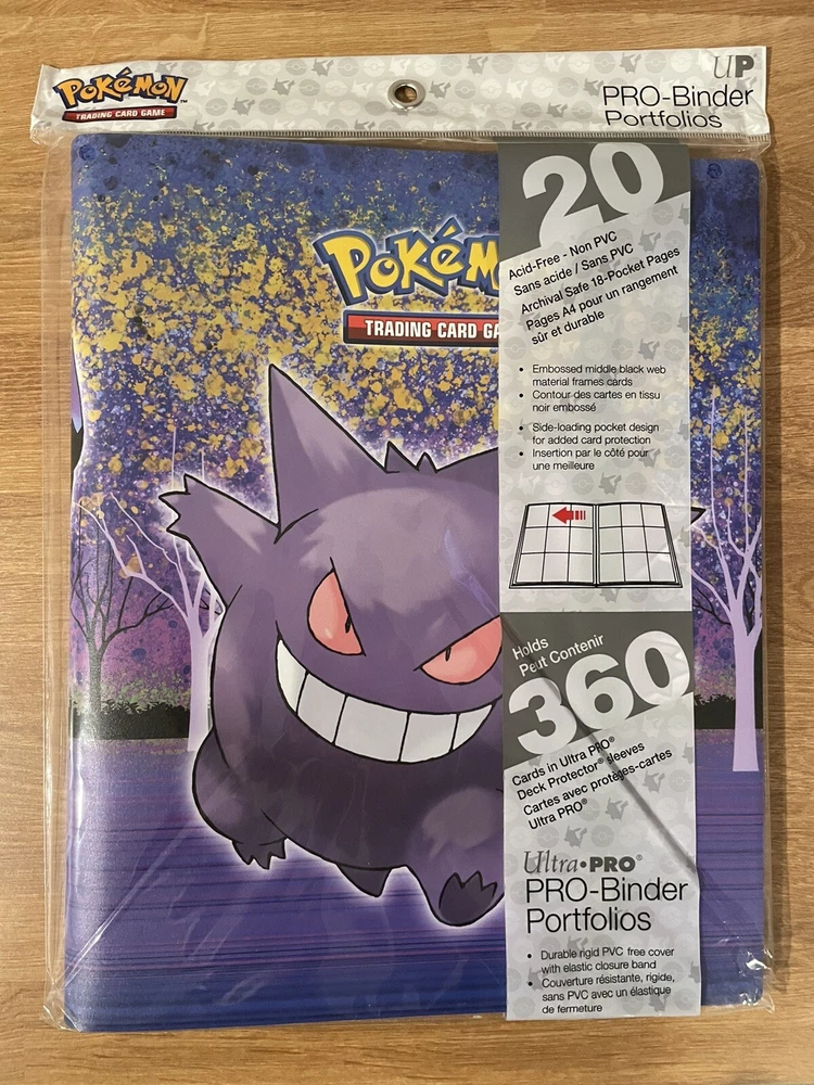 From the Ultra Pro website **Sold Out** on Ultra Pro site Pokemon Gengar Binder Description: Ultra PRO’s 9-Pocket PRO-Binder for Pokémon features a vibrant, full-art cover and an elastic strap closure. Side-loading pockets and low-friction material help keep cards in place. Safely stores up to 360 cards in archival-safe, acid-free, non-PVC pages. Officially licensed Pokémon Trading Card Game accessory, featuring Mew Holds up to 360 standard size cards Low-friction material and side-loading pockets help keep cards in place Elastic strap closure Made with archival-safe, acid-free, non-PVC materials