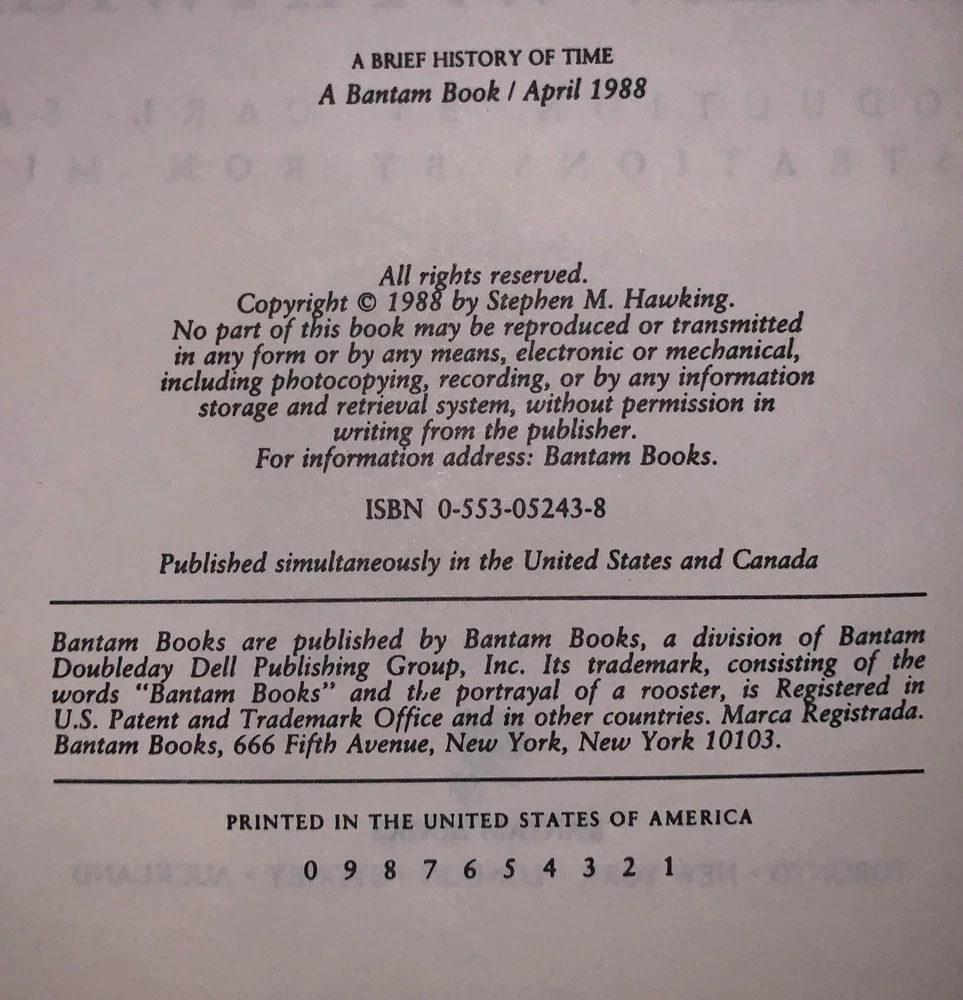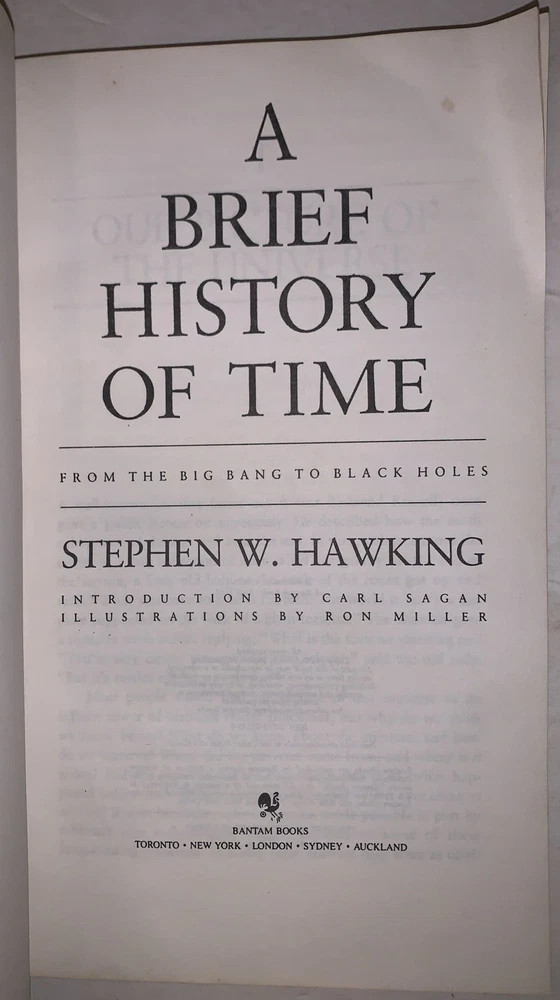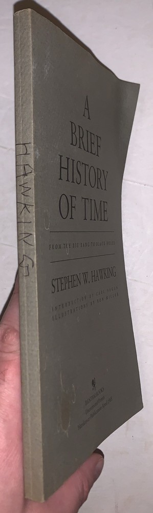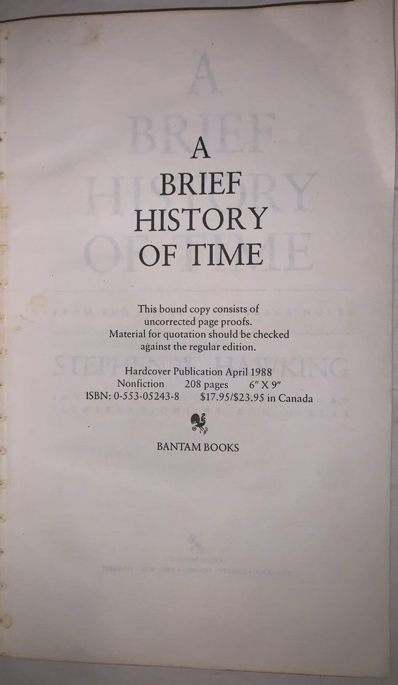A Brief History of Time From the Big Bang to Black Holes by Stephen W. Hawking Introduction by Carl Sagan Illustrations by Ron Miller New York: Bantam Books 1988 First Edition, Uncorrected Proof. Printed in advance of the first trade edition for pre-publication review and editorial use. Octavo, 187 pages, publisher's original grey wraps. Corner bent, some discoloration, "Hawking" written on spine, crease along spine, else in good + condition. If you have any questions, feel free to ask, and don't forget to check out my other listings.
