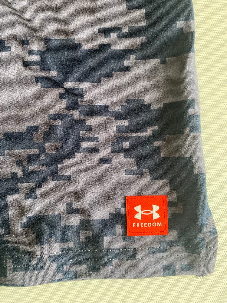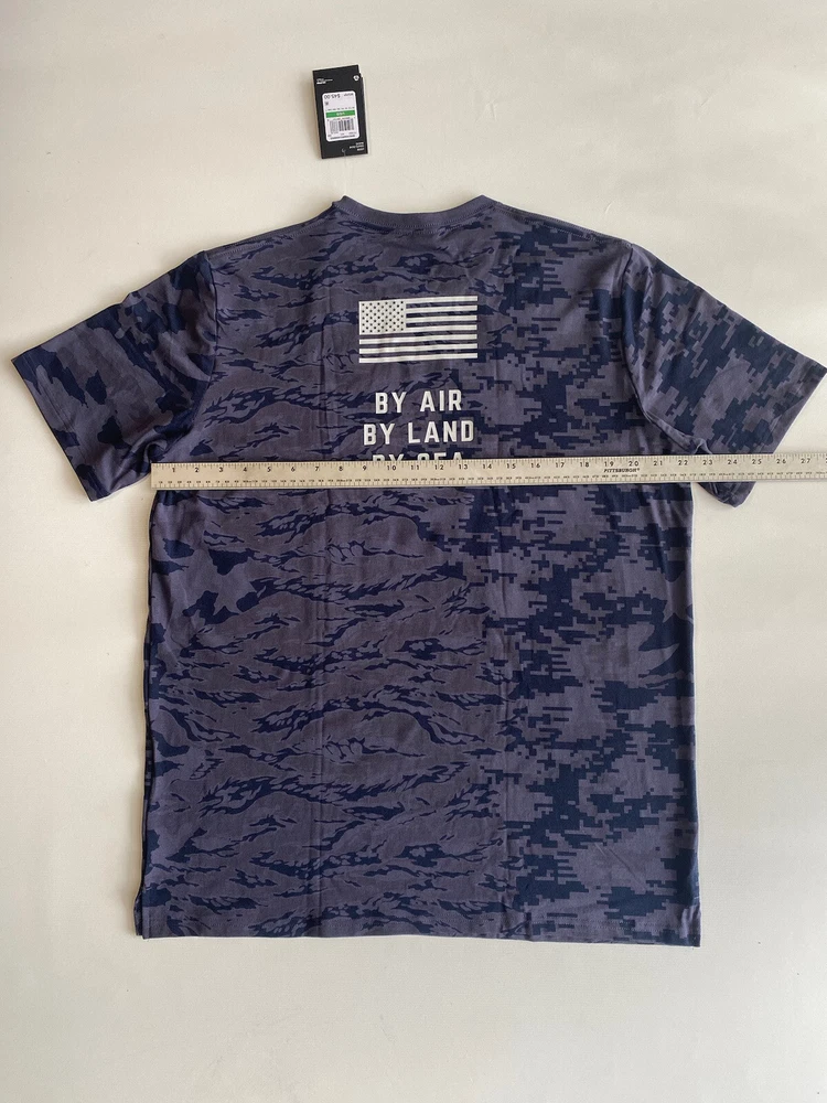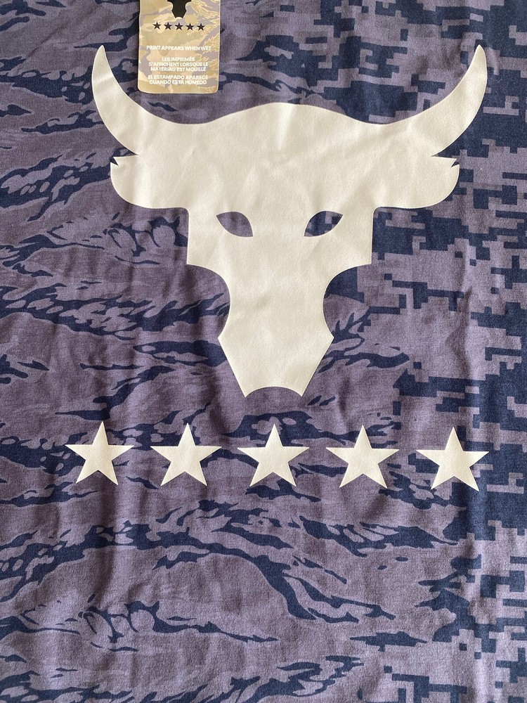 This Under Armour Project Rock T-Shirt is perfect for gym and training sessions or casual wear. The blue camouflage pattern with a logo accent adds a touch of style. The shirt is made of a polyester, cotton, and elastane blend and is machine washable for easy care. The pullover style with a crew neck and short sleeves makes it a great choice for all seasons. The T-shirt is unlined, tagless, and non-iron, ensuring maximum comfort. Please refer to the pictures for shirt length and chest size. Condition of the item is New w/ Tag. Shipped asap by USPS First Class Mail.
