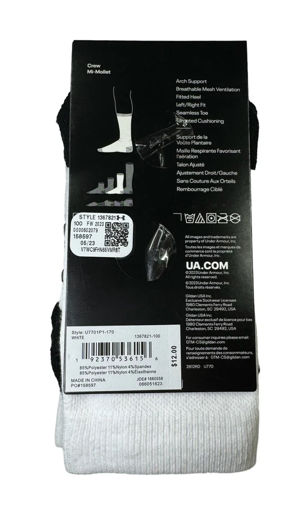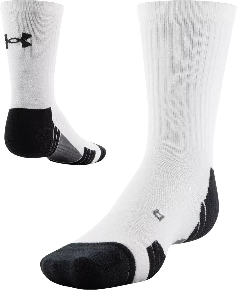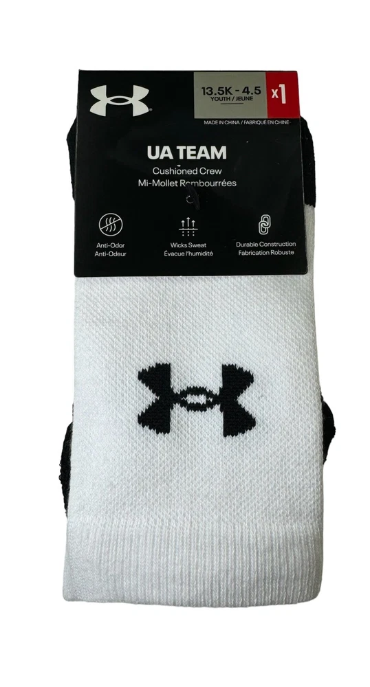 UNDER ARMOUR Youth UA TEAM Cushioned Crew Mi-Mollet 1 Pair Socks White Color 13.5K - 4.5 NEW!!! UNDER ARMOUR UA TEAM 1-Pair Cushioned Over-The-Calf Socks YOUTH Size Available: 13.5K-4.5 PATTERN: Solid with Logo COLOR : White RETAIL PRICE: $12.00 + Tax Description: 85% Polyester 11% Nylon 4% Spandex Machine Wash Cold Imported