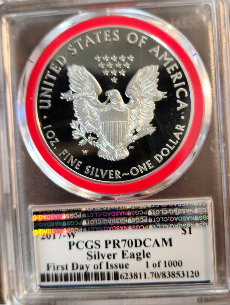 2017-W American Silver Eagle — PCGS PR70DCAM — First Day of Issue — Trump 45th Presidential Inauguration — 1 of 1000 (Red Gasket) Highlights West Point Mint (W) Proof ASE, 1 oz .999 fine silver PCGS PR70DCAM (perfect deep cameo) First Day of Issue special label “45th Presidential Inauguration” commemorative label Limited label run: 1 of 1000 (rare slab designation) Factory PCGS slab — untouched, mint condition