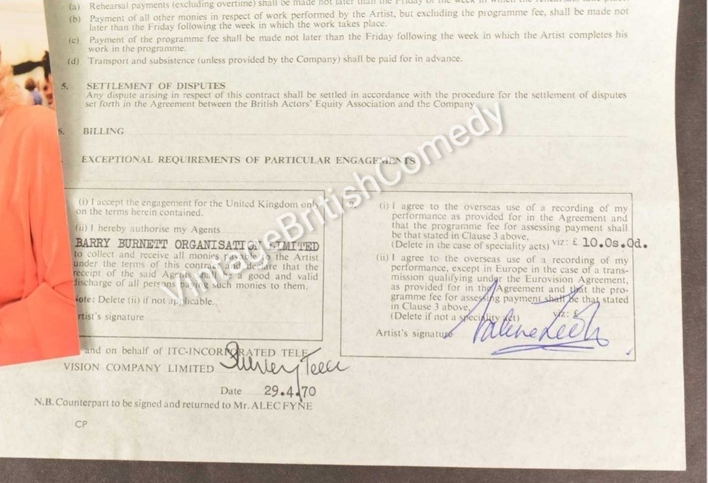 A very rare opportunity to own a piece of vintage British comedy memorabilia from the personal archive of the ridiculously gorgeous Valerie Leon. This is her hand signed contract with ITC dated 29th April 1970 for her appearance on The Des O'Connor Show, hand signed by Valetie Leon as well as a representative of the company. Also comes with a photo of older Leon reunited with Des not long before his 2020 death, also hand signed by Leon. Leon kept this and other film, television and theatre contracts and memorabilia in her own personal archive for over 50 years until some were auctioned off for charity. See my listings for other rare vintage British comedy memorabilia including other items from Valerie Leon's personally collection.